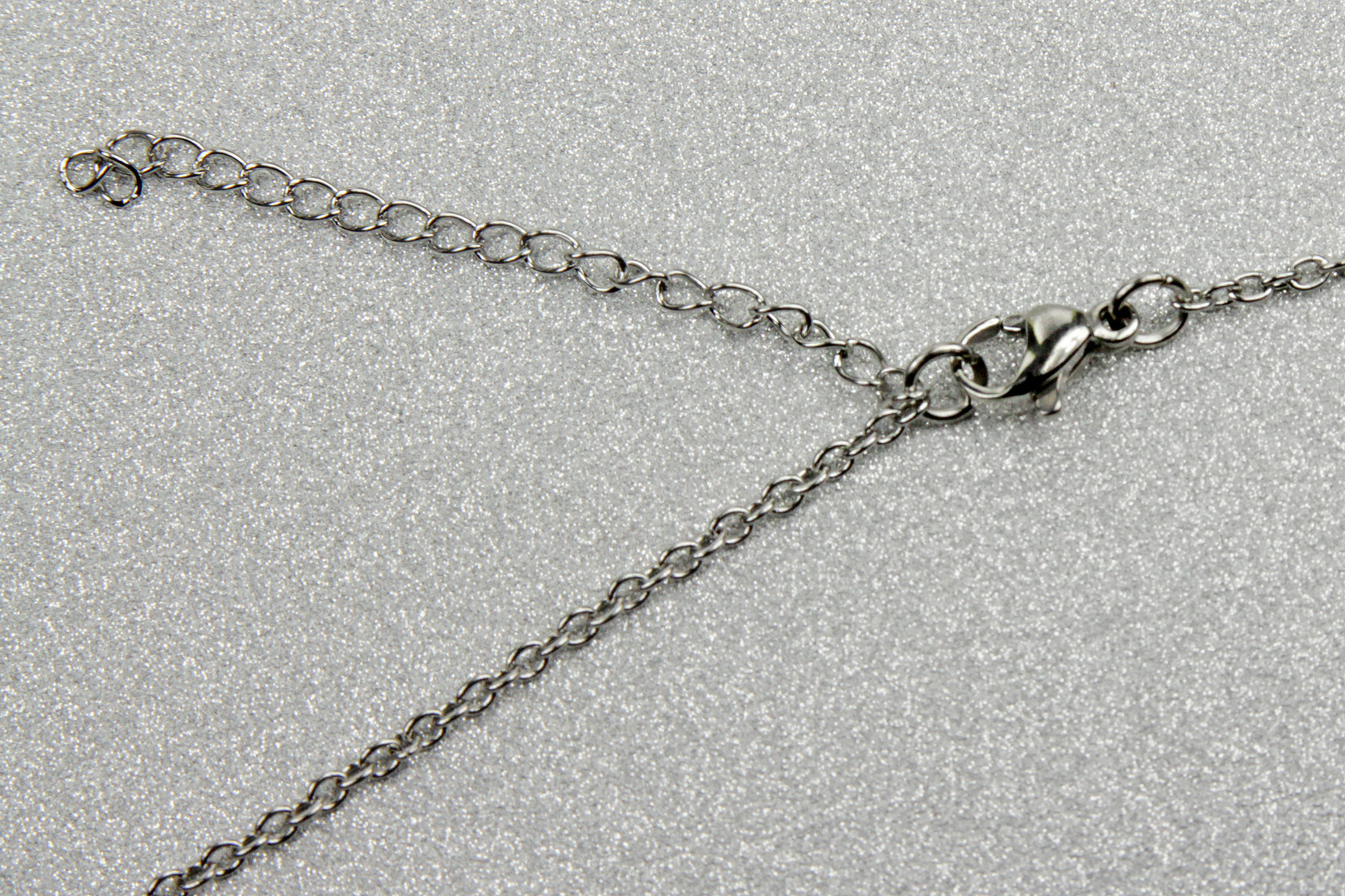The necklace is advertised as being 18″ in length, with a further 2″ length of adjustment chain. When measured in a straight line (clasp open), the necklace measures approximately 46.5cm in length (including clasp), while the wider-link adjustment chain extends this to approximately 52cm in total length. The clasp is a standard ‘lobster claw’ style jewelry clasp.