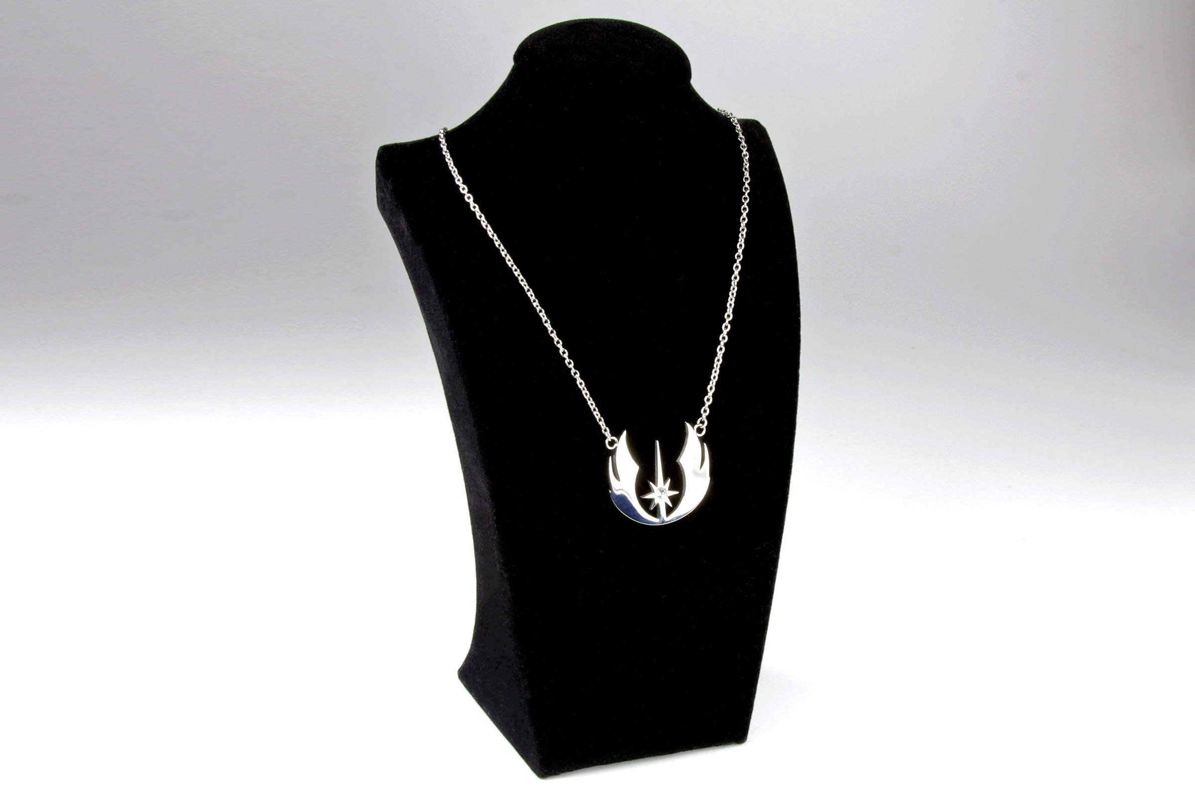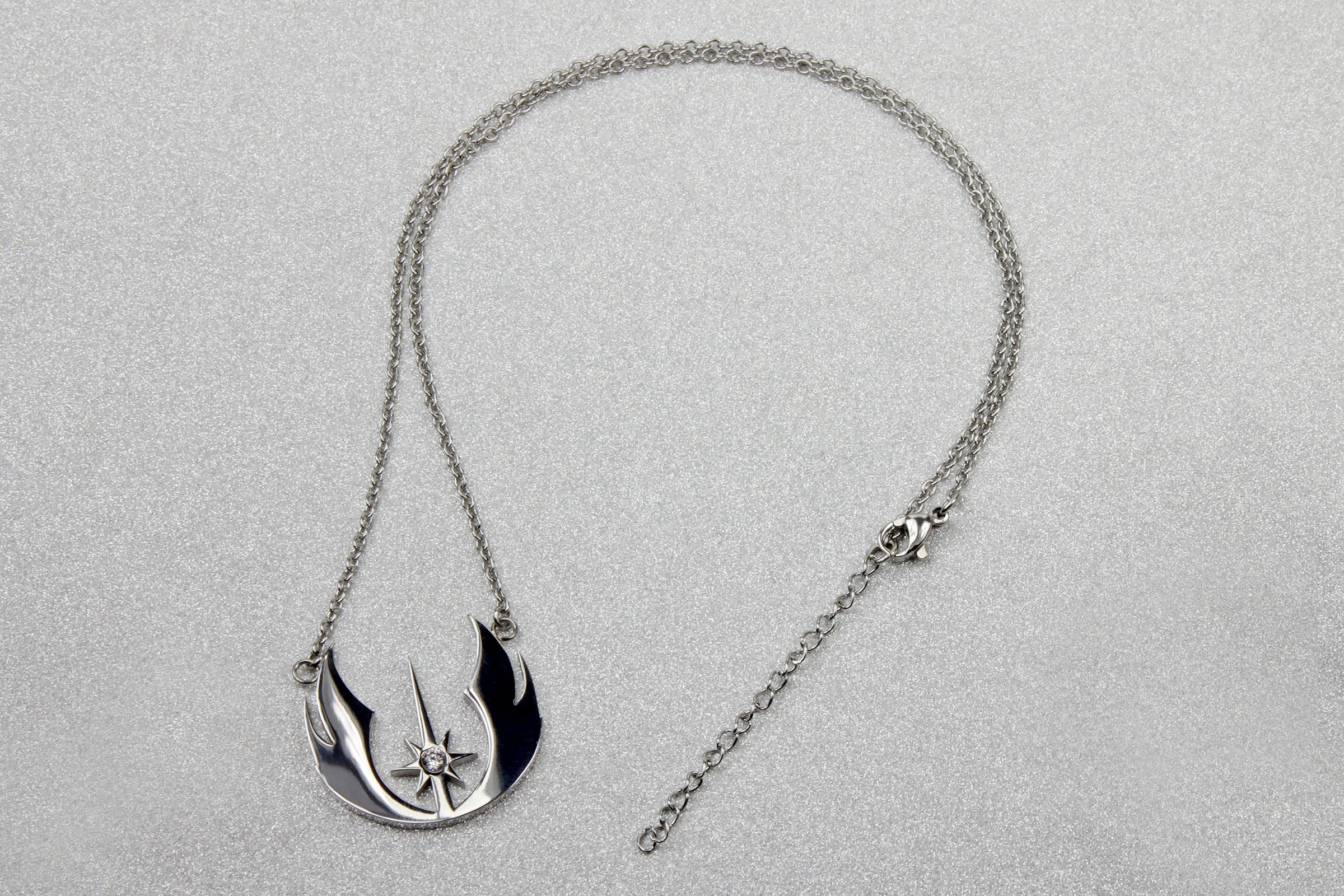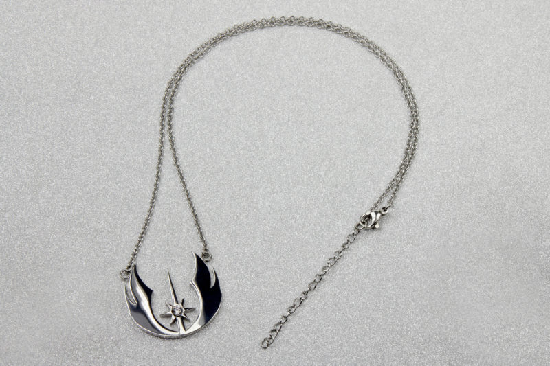 The Jedi Order Symbol necklace features a cut-out pendant of the Jedi Order symbol, with a large clear Cubic Zurconia stone set in the center. The pendant is hung from two silver-tone chains, attached on either side to the pendant. The silver-tone Stainless Steel has a gorgeous shiny gloss finish. I tend to associate Jedi with silver rather than gold, as most Jedi lightsabers have a silver-tone finish – so the colour works well for this design.