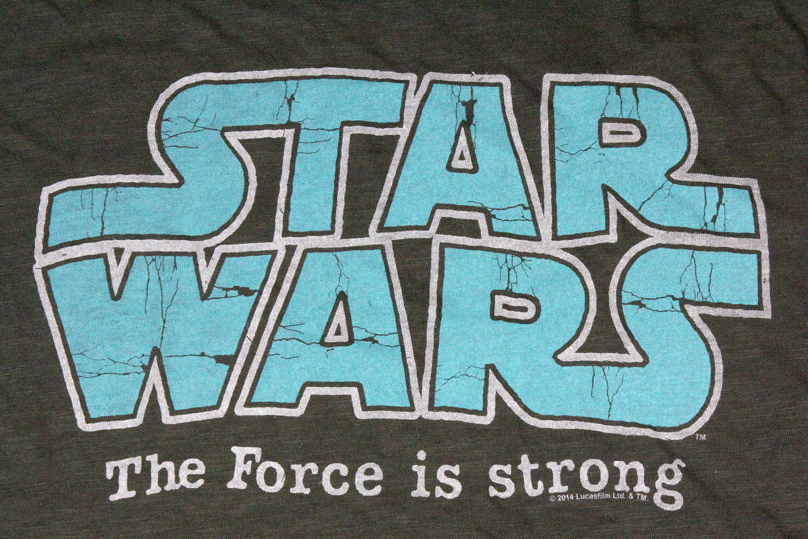 The second top is a darker gray than the first, with white contrast edging at the neckline and arm holes. It features the classic Star Wars logo in a cracked effect blue-green with pale grey outline. I love the line they used underneath – “The Force is strong”. The fabric is 100% cotton, a little bit thicker than the first shirt. The curved hem is a great touch for this style, it’s my favourite top out of the three. It measures approximately 42cm across (underarm to underarm).