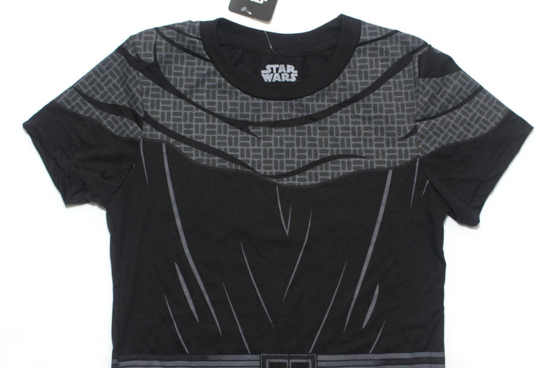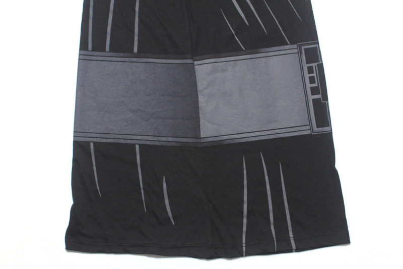 I find it interesting that the belt print is darker on the back than on the front. In my photo below, you can see the difference at the right side seam (back of garment on left, front of garment on right). The rest of the details (fabric drape lines and cloak) remain the same front and back, so I can only assume this color difference is deliberate, to hint at the presence of Kylo Ren’s cloak that would hide the belt? Anyway, I think this is a fun tee for casual wear – I need to balance out all the Darth Vader apparel in my wardrobe with some featuring the new bad guy!