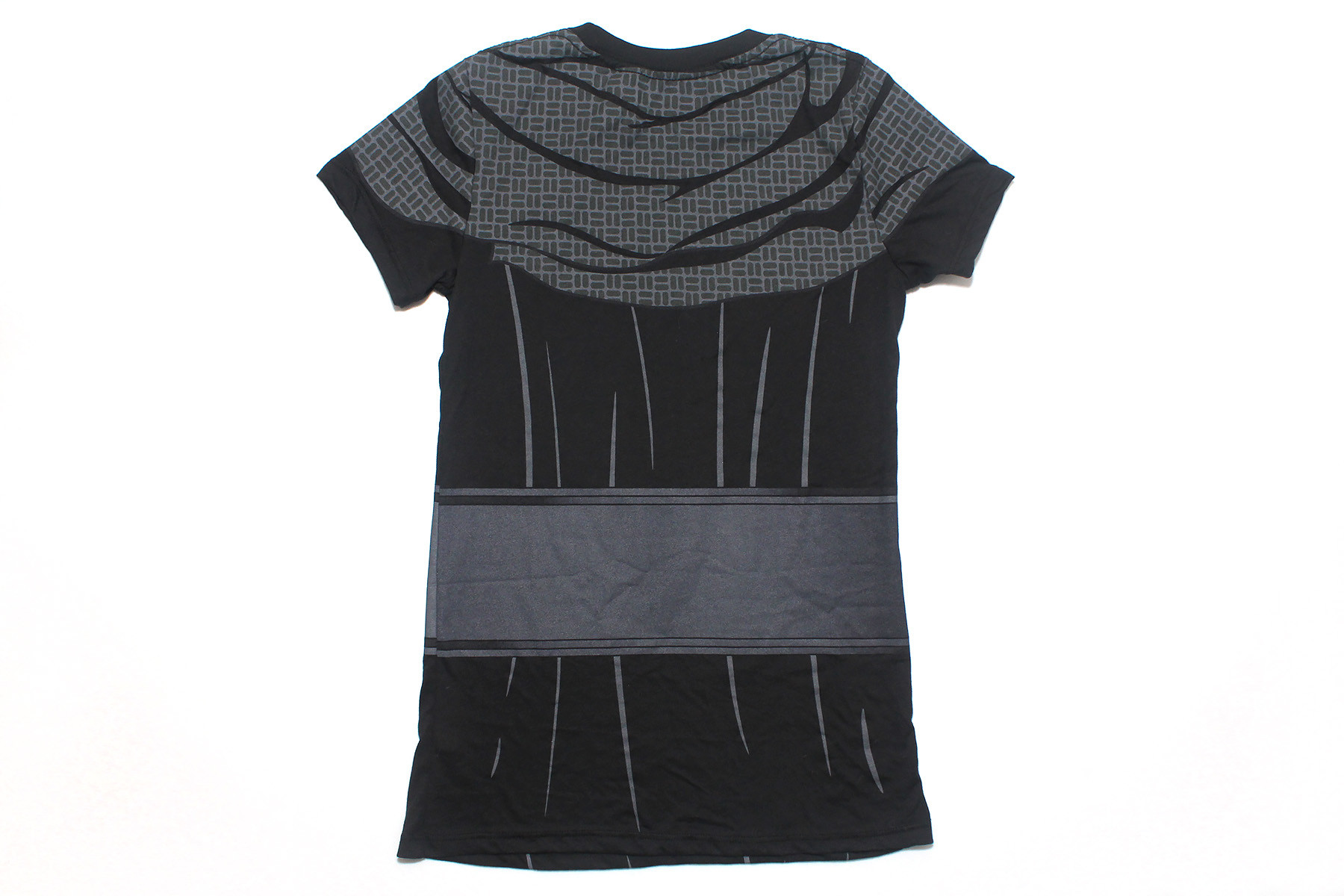 The women’s Kylo Ren costume t-shirt is available from SuperHeroStuff in sizes S to XXL, priced at US$23.99 each (+US$2 for size XXL). SuperHeroStuff can ship internationally, which is great. I bought mine in size small – it measures approximately 40cm across the chest (underarm to underarm), 43.5cm across the lower hem, and 60cm from front neckline to front lower hem.