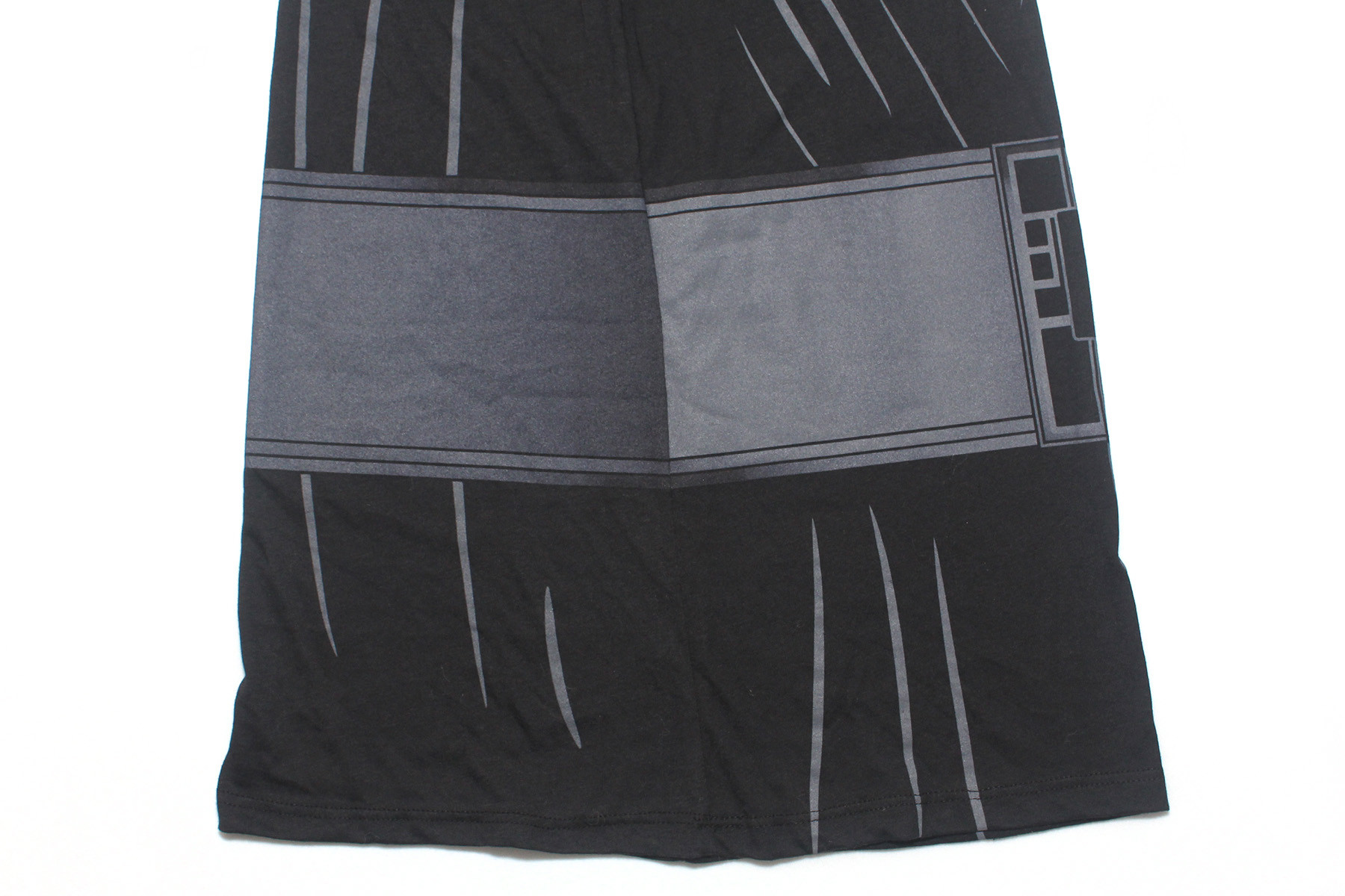 The women’s black t-shirt features an all-over print of Kylo Ren’s costume details – cloak/shawl around the shoulders/neckline, belt with front detail, and fabric drape lines. The fabric is 50% cotton, 50% polyester – it is nice and soft. The sections with minimal printing stretch well, but the printed belt and cloak sections restrict the fabric’s stretch a little more. This makes the t-shirt a little ‘stiff’ to put on, but this should soften up a little more with wear. Large printed sections on knit fabric do have a tendency to crack over time, but printed garments should always be treated with care to protect the print from damage.
