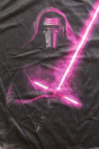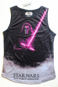 One of my first Force Friday purchases was this Kylo Ren tank top from Hot Topic. I paid US$24.50 (as part of a ‘buy 2, get 1 free promotion), though you’ll need to check for available sizes. I bought mine in XS, it measures approximately 44cm across the chest (underarm to underarm), 43.5cm across the lower edge (straight across, side seam to side seam), and 54.5cm from front neckline to front hem. The fabric is 100% polyester, which is very slightly see-through when wearing bright colours underneath. The armholes are cut smaller than other muscle cut tank tops I’ve bought recently, so it doesn’t show undergarments at the side. Both the front and back lower hems are curved, which is a nice style. I was drawn to the strong, dark pink of this design (an interesting choice rather than red), and the smoky affect around the bottom – I haven’t found this artwork used on other apparel yet. So much of the apparel released on Force Friday used the same stock promotion imagery, so it was great to see the Hot Topic range use different designs – this top was in my first order that day!