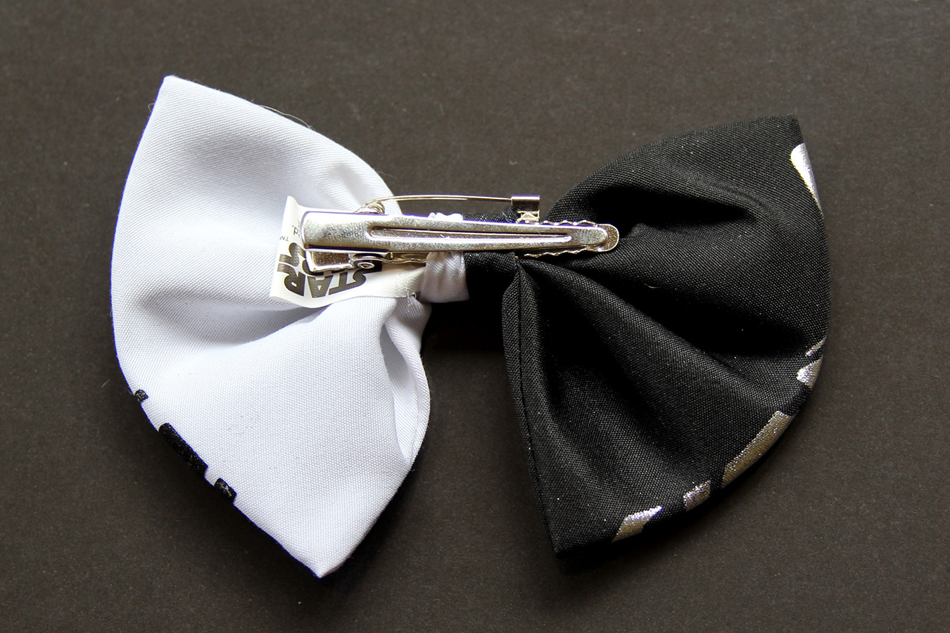 My purchase included two bows – one R2-D2 themed, the other Imperial with stormtrooper and Darth Vader designs printed on the front. These bows have an alligator clip at the back for wearing in hair, together with a brooch clasp for wearing on clothing. The R2 one is very nice, with embroidery and and printed details, measuring approx 12cm across. The designs on the Imperial one are a little more hidden/distorted by the gathering of the bow, but it’s still very apparent to fans who will recognise the helmet designs. That could be a good thing, the designs will appear more abstract and subtle to non-fans, together with the bow’s smaller size of approx 10cm across. These bows originally retailed for US$6.50 each.