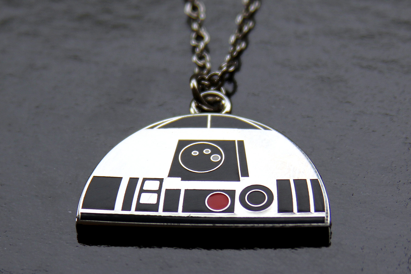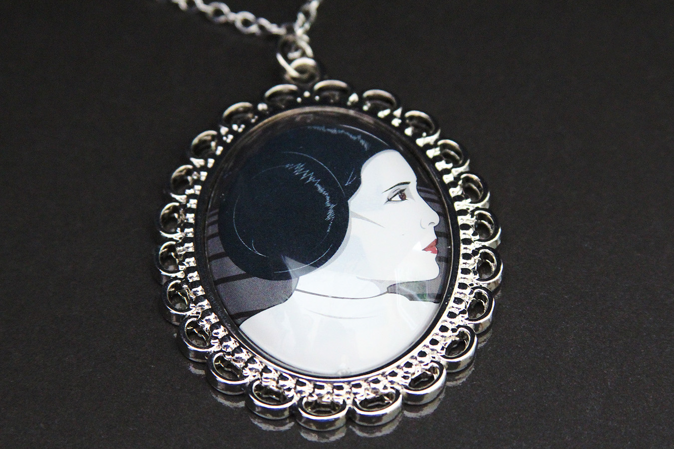 Princess Leia – This one is by far the largest and heaviest of the pendants, measuring approx 5cm tall and 4.3cm side. It features a silver metal setting with a cameo style picture of Princess Leia (reminds me of Craig Drake’s style of Star Wars art prints) under a clear dome. The chain measures approx 54cm long, with a further 9cm of wider chain for adjusting. Combined with the long chain and pendant size, this one hangs a little low on me, I’ll probably choose another shorter chain to wear with the pendant. A slightly more feminine style pendant than the others, it could also look good on hung from something like velvet ribbon in a choker style.