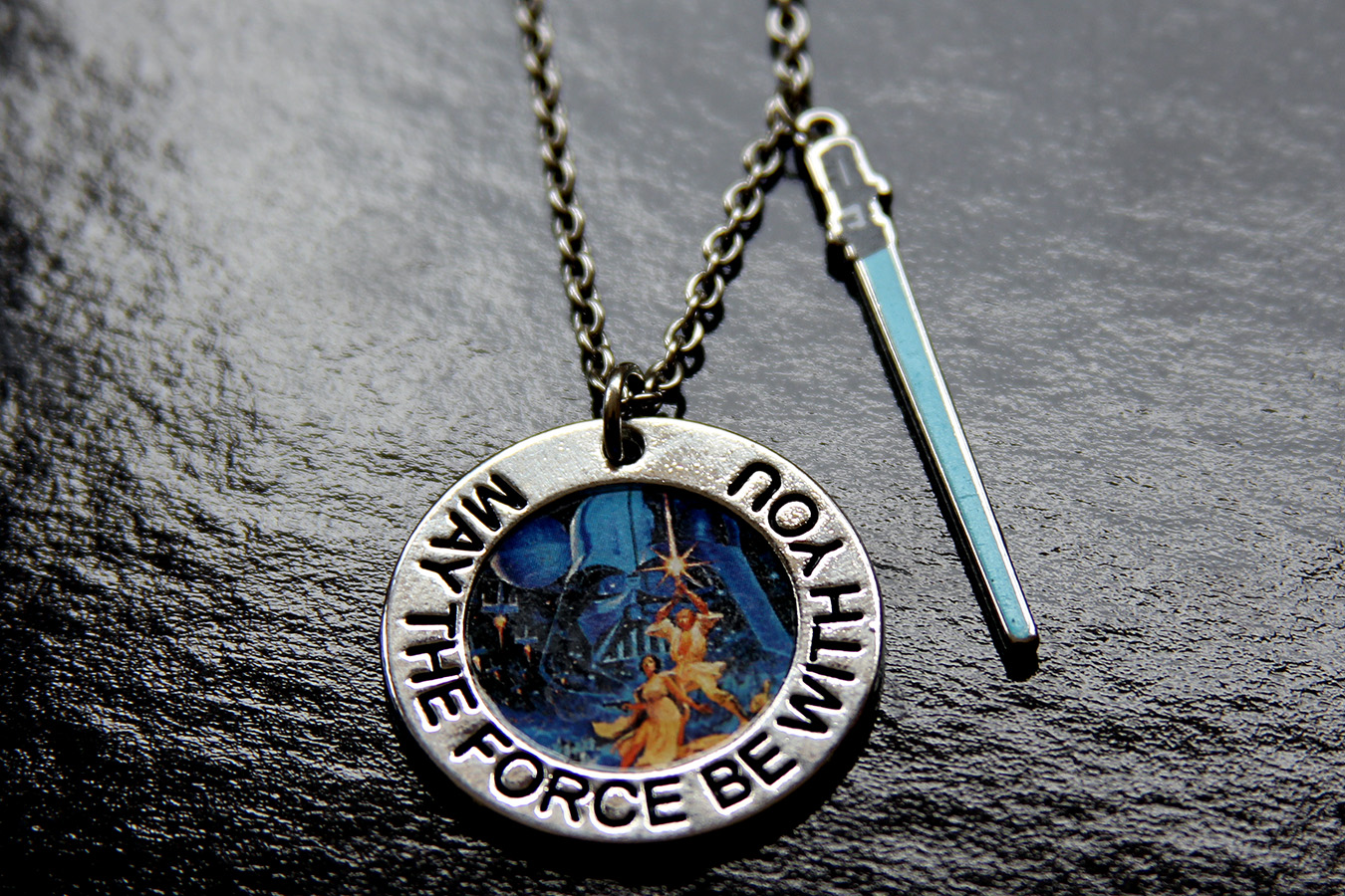 MTFBWY – this ones is a silver metal disc with ‘MAY THE FORCE BE WITH YOU’ stamped in black around the rim, with classic poster set in the center. Attached to the chain is a second pendant, featuring Luke’s blue lightsaber. It’s position will vary depending on how long you wear the adjustable chain, but at the shortest length the lightsaber hangs just above the disc. It can’t really be worn at the longest length, as the lightsaber can’t pass through the ring of the disc pendant, and stops it hanging properly unless you move the lobster clasp around instead of directly behind your neck as usual. The chain measures approx 51cm, with a further 6cm of wider chain for adjusting – I wear it at the shortest length, so the lightsaber hangs nicely.