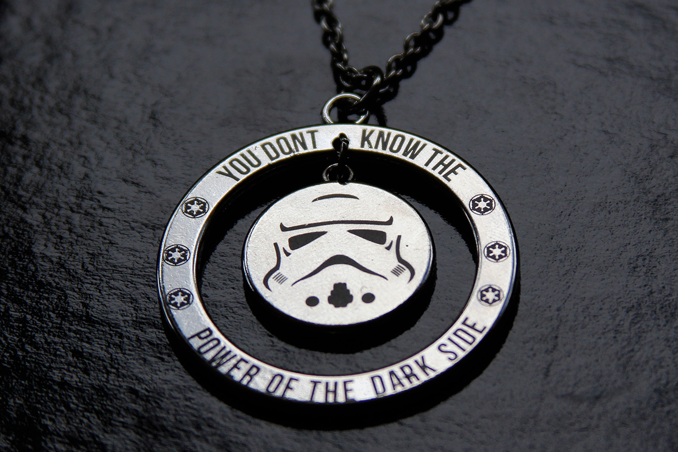 Stormtrooper – featuring a stormtrooper helmet design printed on a central disc, it has a second ring that has “YOU DONT KNOW THE POWER OF THE DARK SIDE” printed on it, with 3 Imperial cogs each side. The ring measures 3.5cm across, with the internal pendant measuring just under 2cm wide. The stormtrooper pendant hangs nice and centred within the ring. It is hung on an adjustable chain with lobster clasp – the chain measures approx 52cm with a further 6cm of wider chain for adjusting.