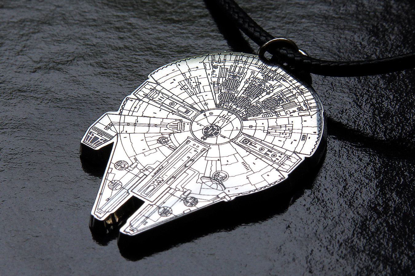 Millennium Falcon – this is a flat metal pendant approx 3.8 x 2.2cm on a braided leather/leather-like cord with standard lobster clasp. It is not an adjustable length – the cord measures approx 52cm long, but you could also cut the cord and string the pendant on the necklace/cord of your choice. This is the most gender-neutral pendant of the ones I bought, I could easily see guys wearing this one too. The Falcon pendant is flat, but has great black line art detail on the front, it’s really cool.