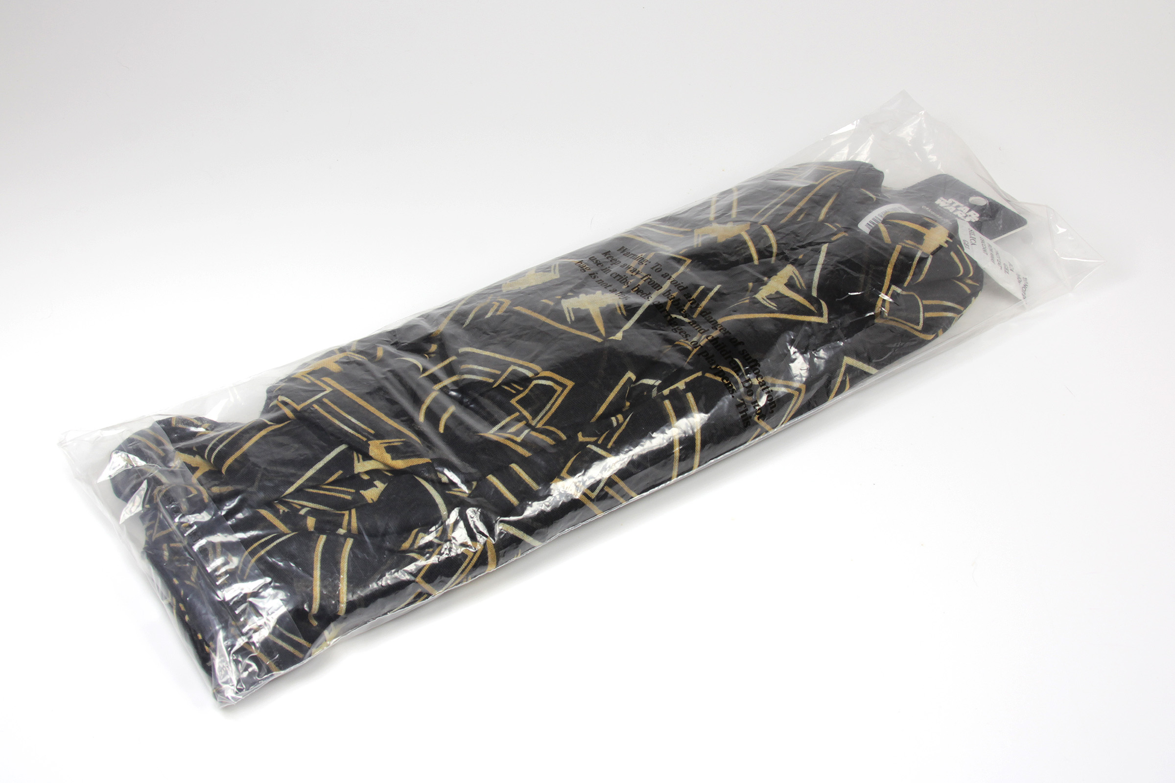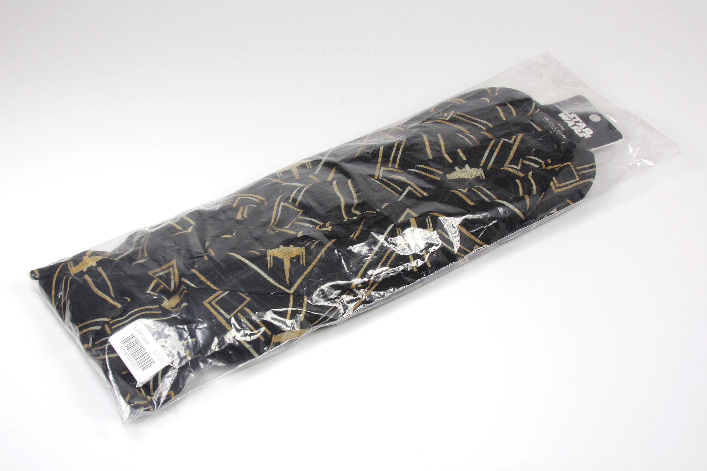 The scarf came packaged in a long clear plastic bag. Inside, the scarf was held in a loop with a black cardboard tag. The tag is printed with the Star Wars and Disney logos, as well as the scarf measurements on the front, while the back of the tag includes the barcode and manufacturer information.