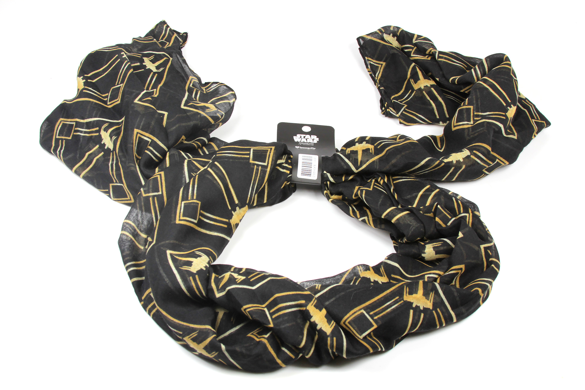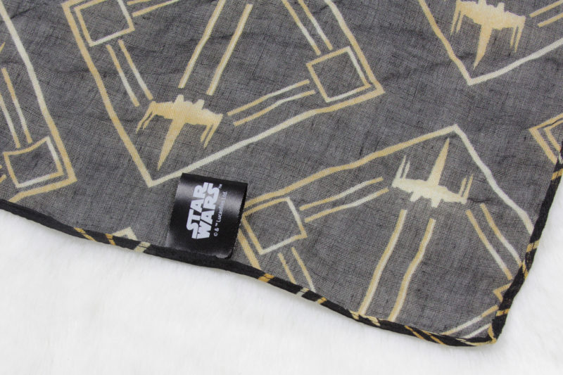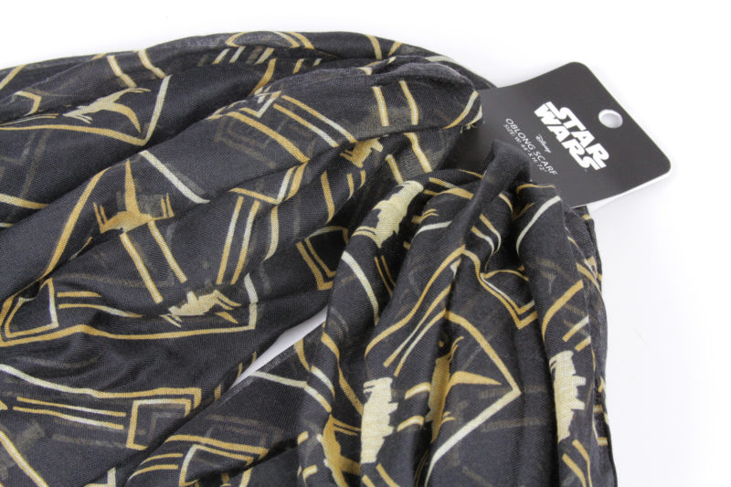 Today’s review features the Loungefly x Star Wars The Last Jedi X-Wing Fighter scarf. Inspired by Art Deco style, the scarf features X-Wing Fighter silhouettes in a repeating yellow-tone pattern against a black background. I absolutely love this print, so the scarf was on my wishlist the moment I saw it!