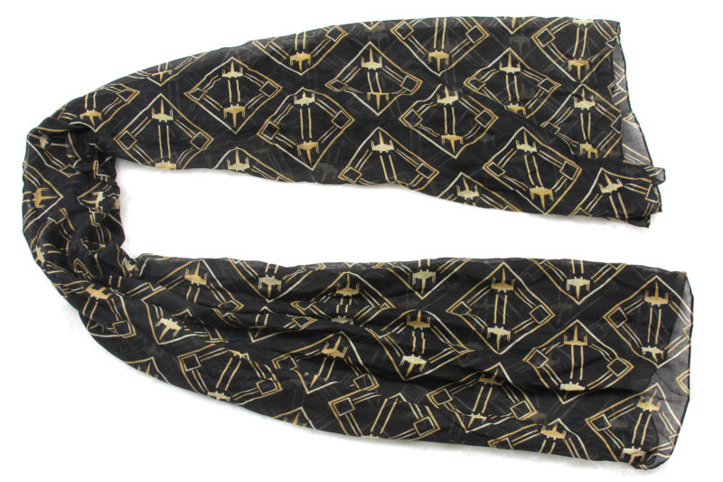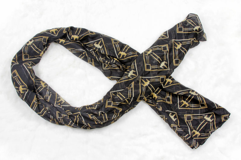 When I first saw this scarf online, I originally wished it was a gold foil print. Gold and black really fits the Art Deco style – but then I remembered the issues I had with my older Star Wars silver foil print scarf. The foil print was unfortunately easy to damage – now that I can see this lovely print in person, I am happy that it is not foil. As the print is part of the fabric (not printed on top like foil), it will last much better – and I know I’ll be wearing this scarf a lot!