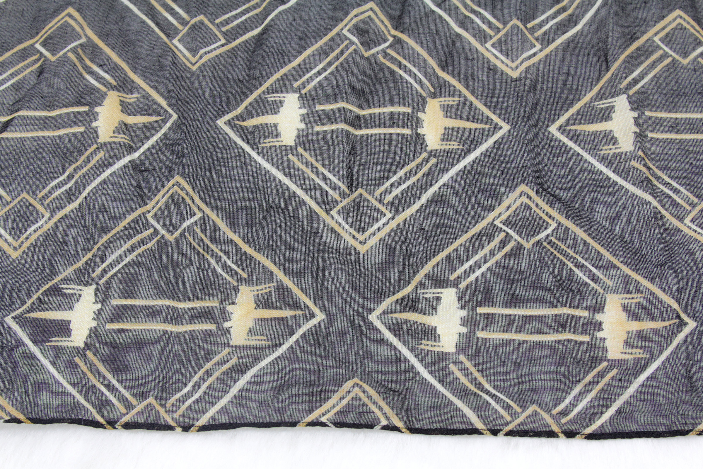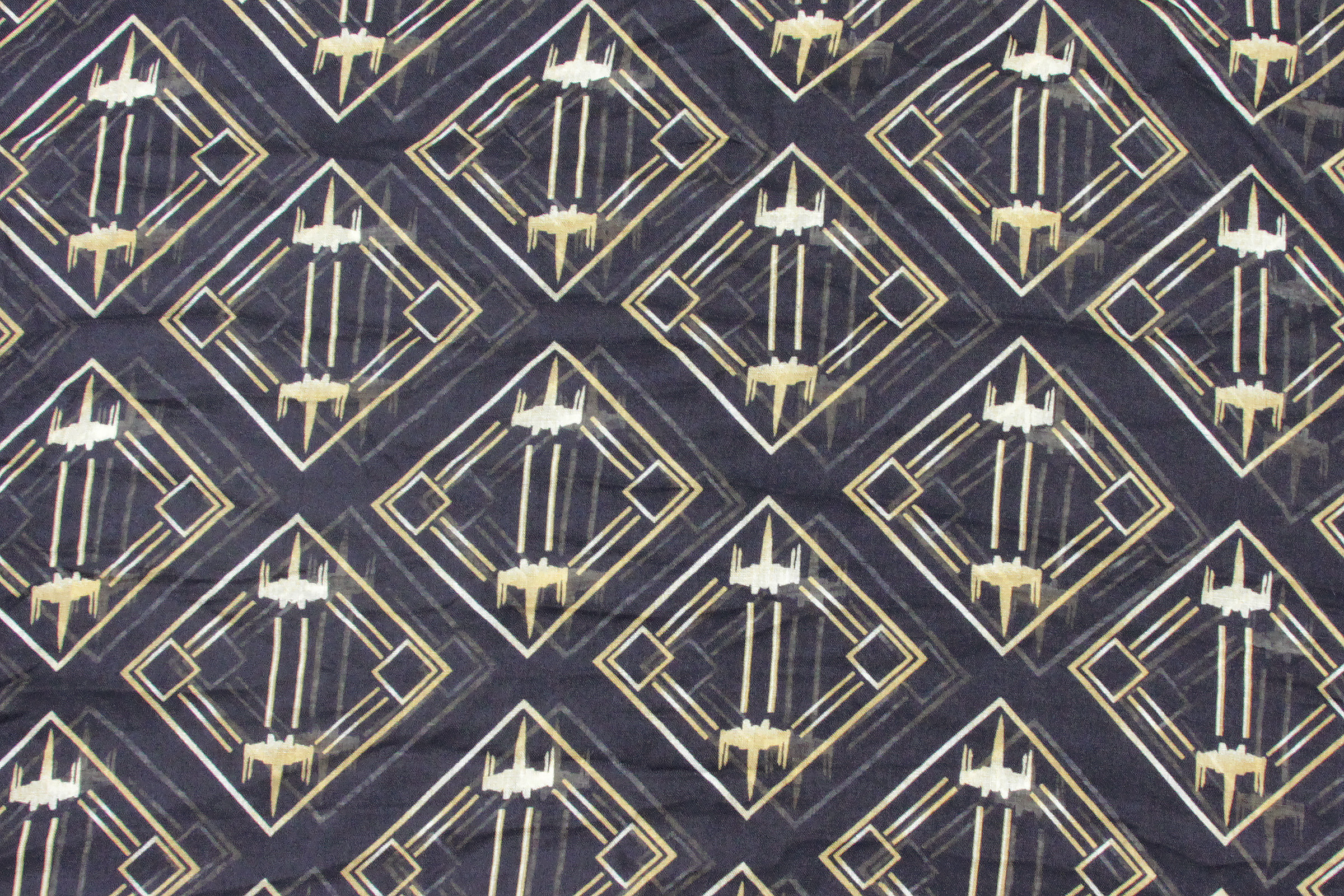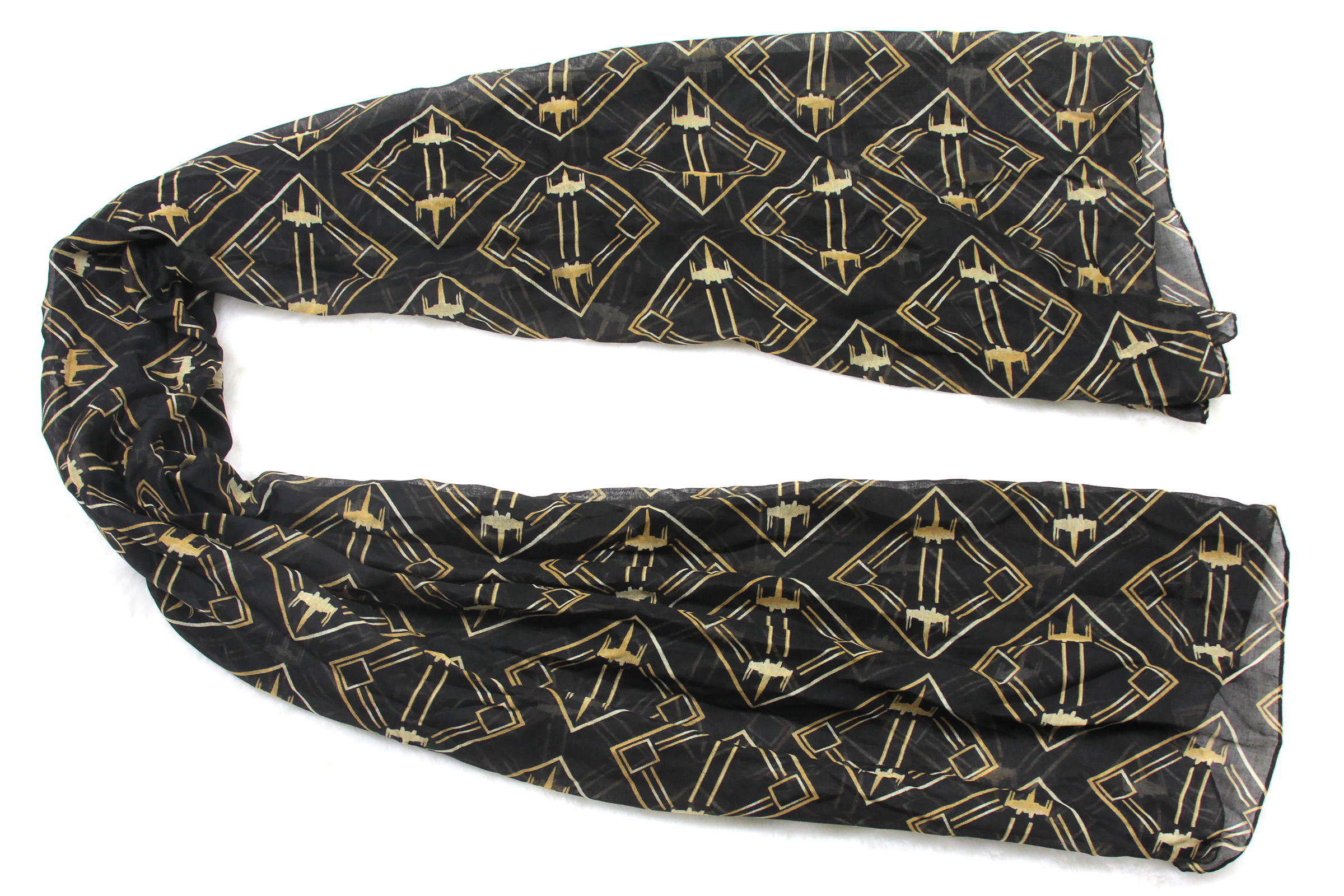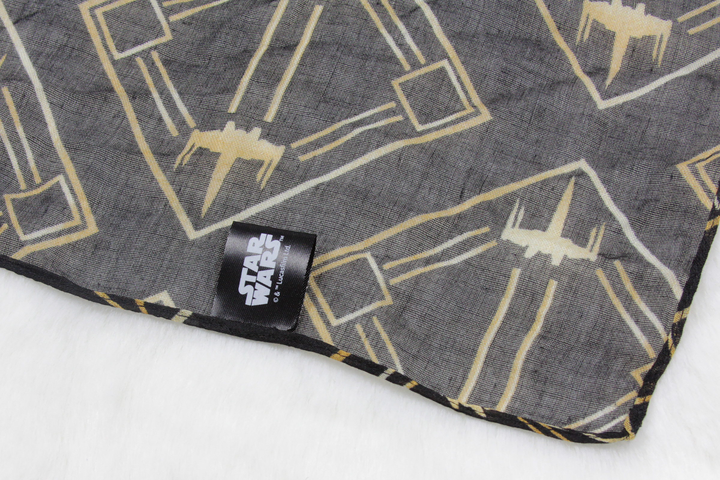 The scarf print design is Art Deco inspired, featuring the silhouettes of X-Wing fighters inside a square, with smaller squares and parallel lines in a symmetrical pattern.