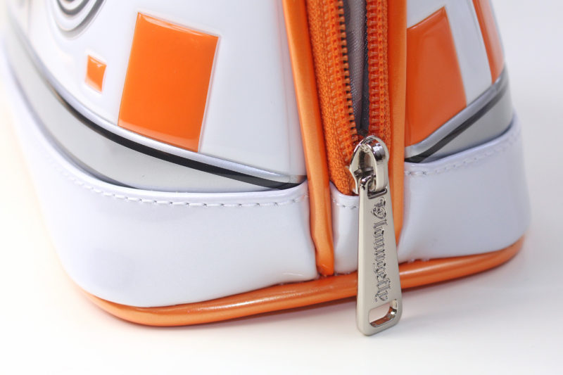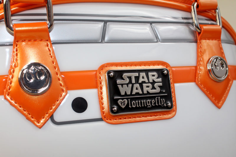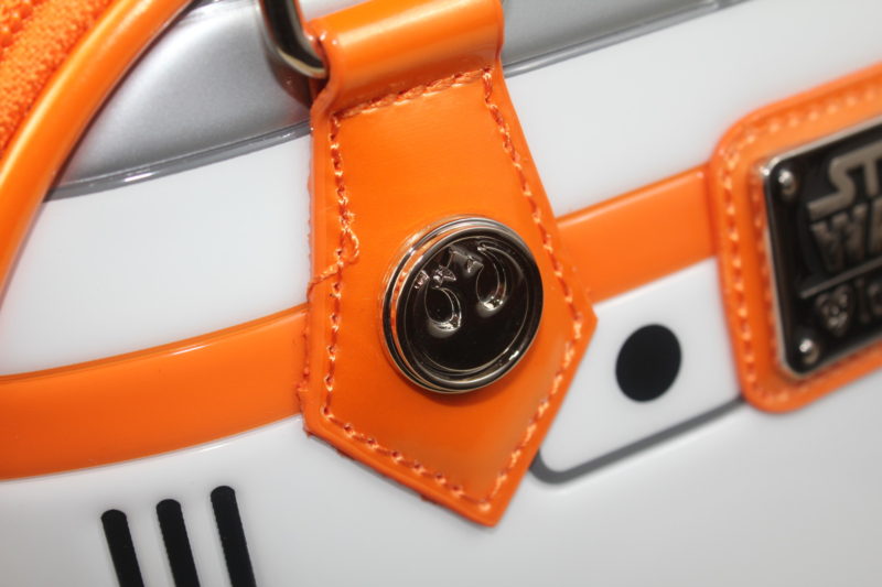 The back of the bag features the Loungefly x Star Wars metal plaque, which is highlighted with black enamel. The metal details of Loungefly bags are always a highlight for me, they really give you the impression of a product designed with quality in mind. The BB-8 bag features silver toned metal hardware – zipper pulls, handle rings, rivets and domes. One of my favourite details of the Loungefly dome bags are the handle rivets – for the BB-8 bag, these feature the Resistance ‘starbird’ symbol.
