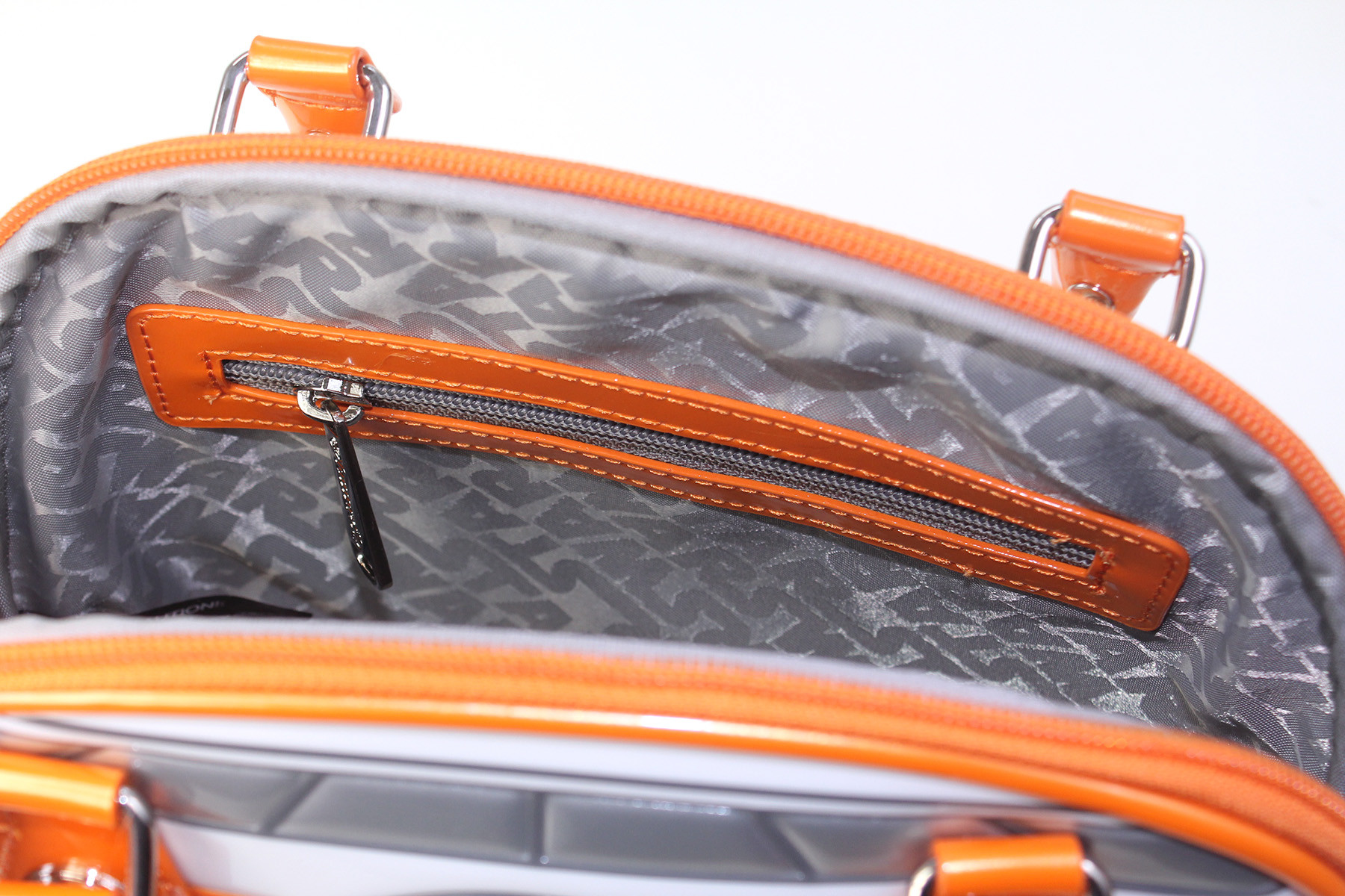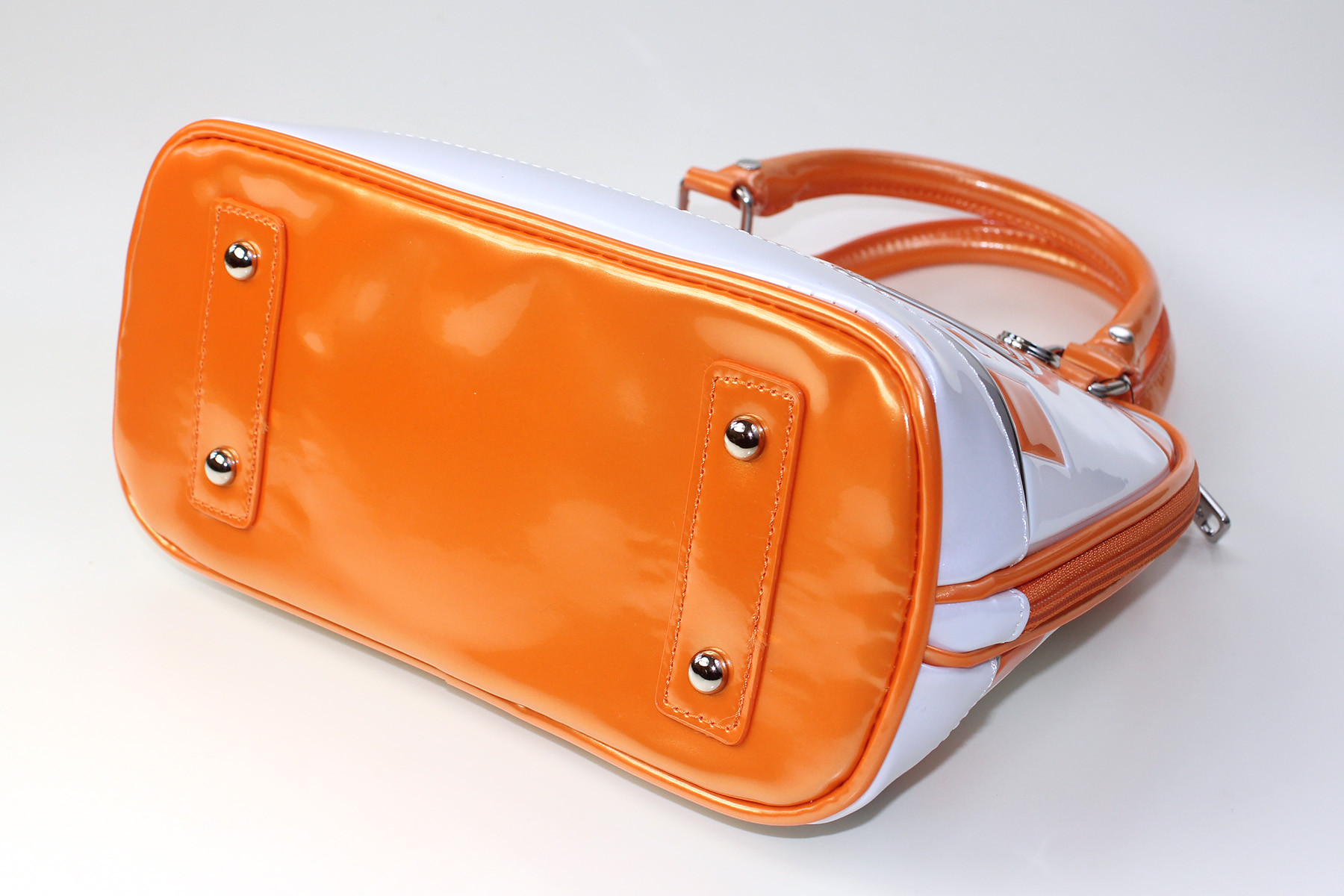 The bottom of the bag is plain orange, and has four metal stud feet, to avoid scuffing the surface when placed down. The bag features orange piping along all the major seams – this is made from the same orange as the bottom of the bag. The orange patent faux leather isn’t a flat orange, it has a slight shimmer to it, which I love – it softens the bold colour a little.