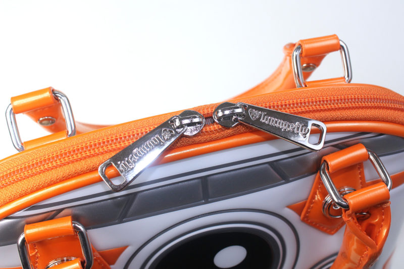 The bag is made from patent faux leather, with printed and embossed details. The main section of the bag is white, with orange, grey and black printed sections – the edges of most printed sections are embossed, which adds an extra level of detail to the design.
