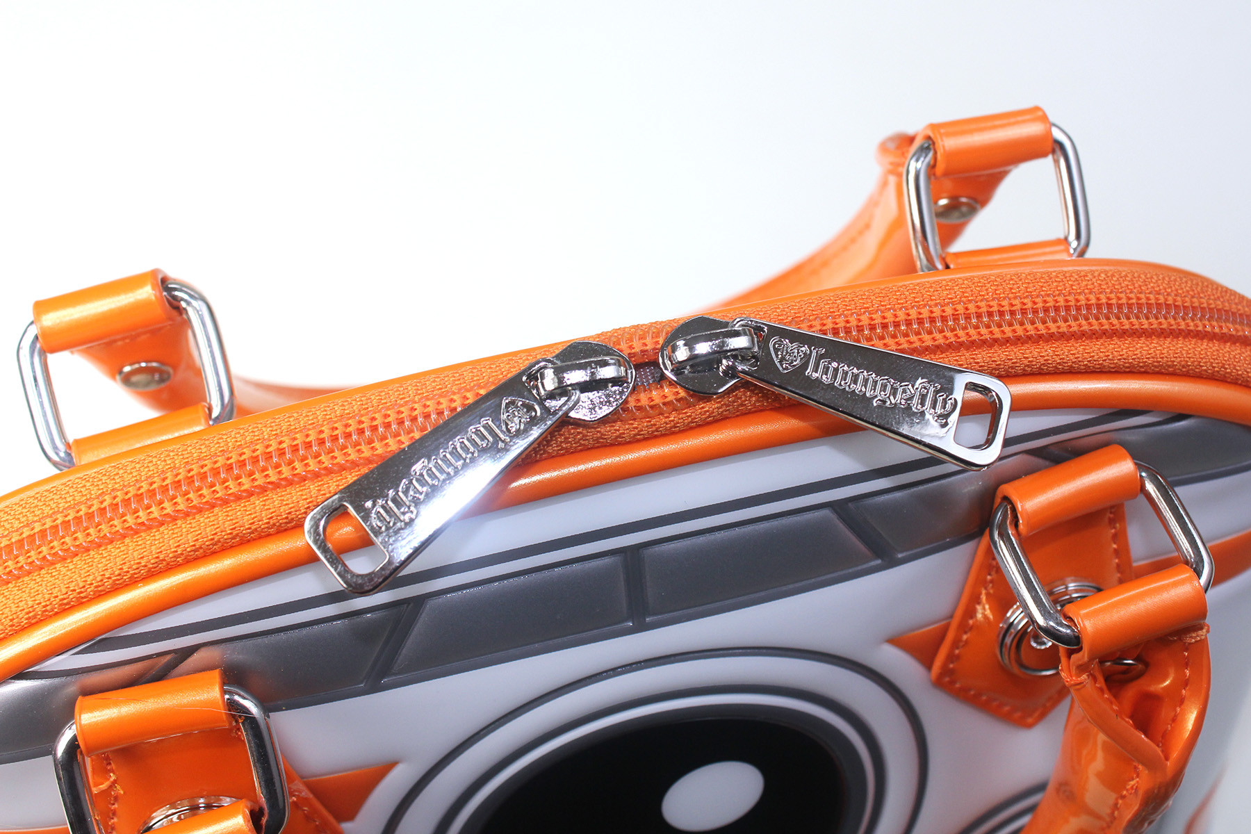 The top zip is orange with two sturdy silvertone Loungefly zipper pulls, and opens fully down each side. The full length top zip allows easy access to the interior, which is really helpful in rigid-shape handbags.