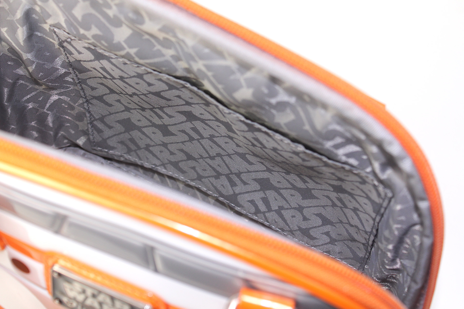 The interior features Loungefly’s printed Star Wars logo lining fabric – but this time in grey. The lining of most Loungefly x Star Wars items is the black version, so it’s fun to see a variation used here – I think the grey works really well with the BB-8 design. There are two pockets inside – a zip-up pocket on one side, and an open pocket on the other side. The internal zip also features the same zipper pull with Loungefly logo as the exterior zipper – I really like the sturdy feel of these zips.