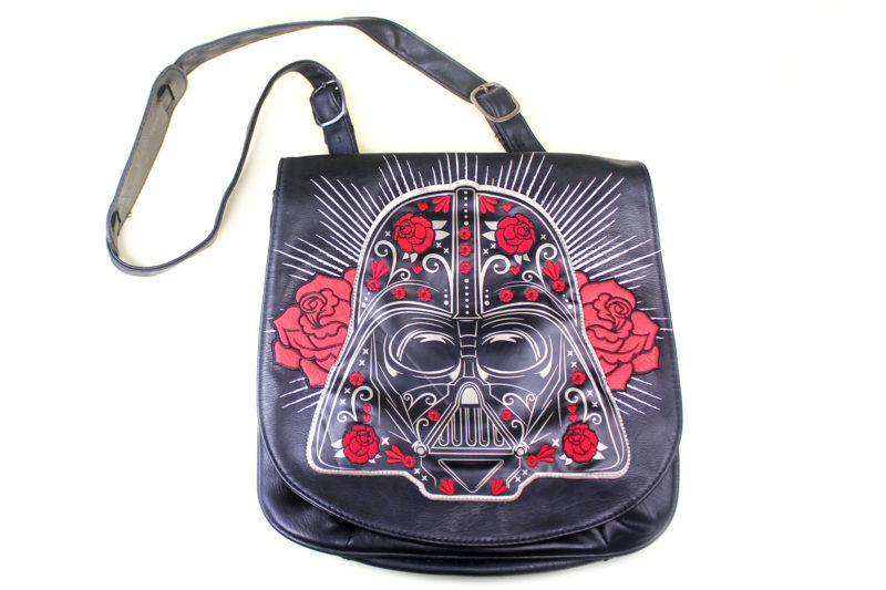 Today’s review features the Loungefly x Star Wars Darth Vader Sugar Skull Roses crossbody bag. One of the very first Loungefly x Star Wars designs, this crossbody bag features a Darth Vader sugar skull design, accented with red roses. This particular design is still used across the Loungefly range, appearing on coin purses and in handbag patterns.