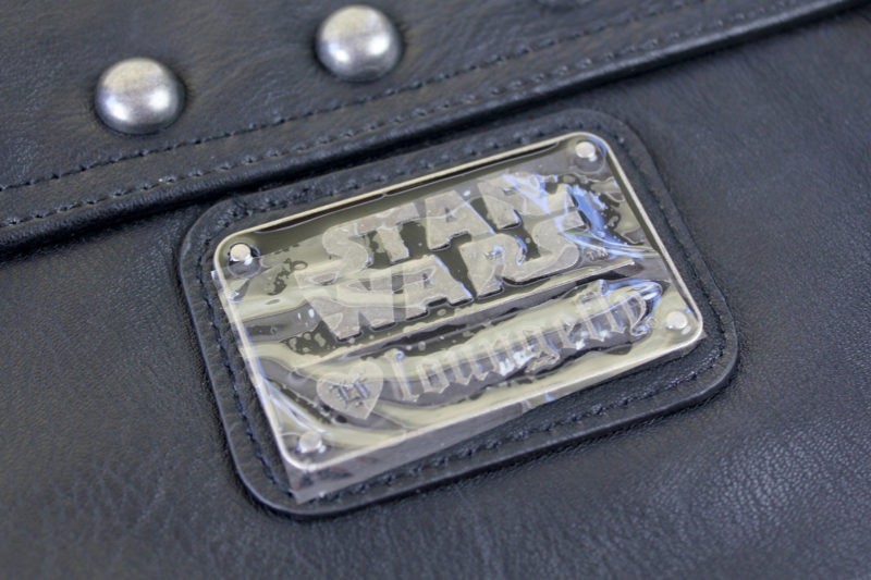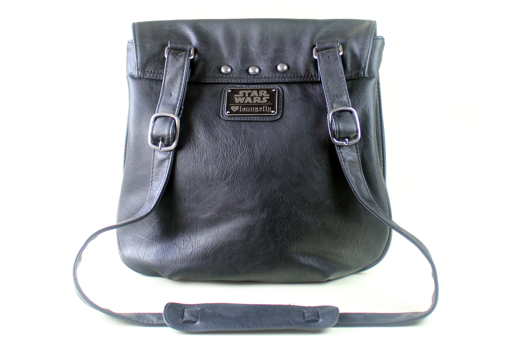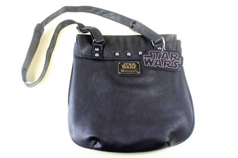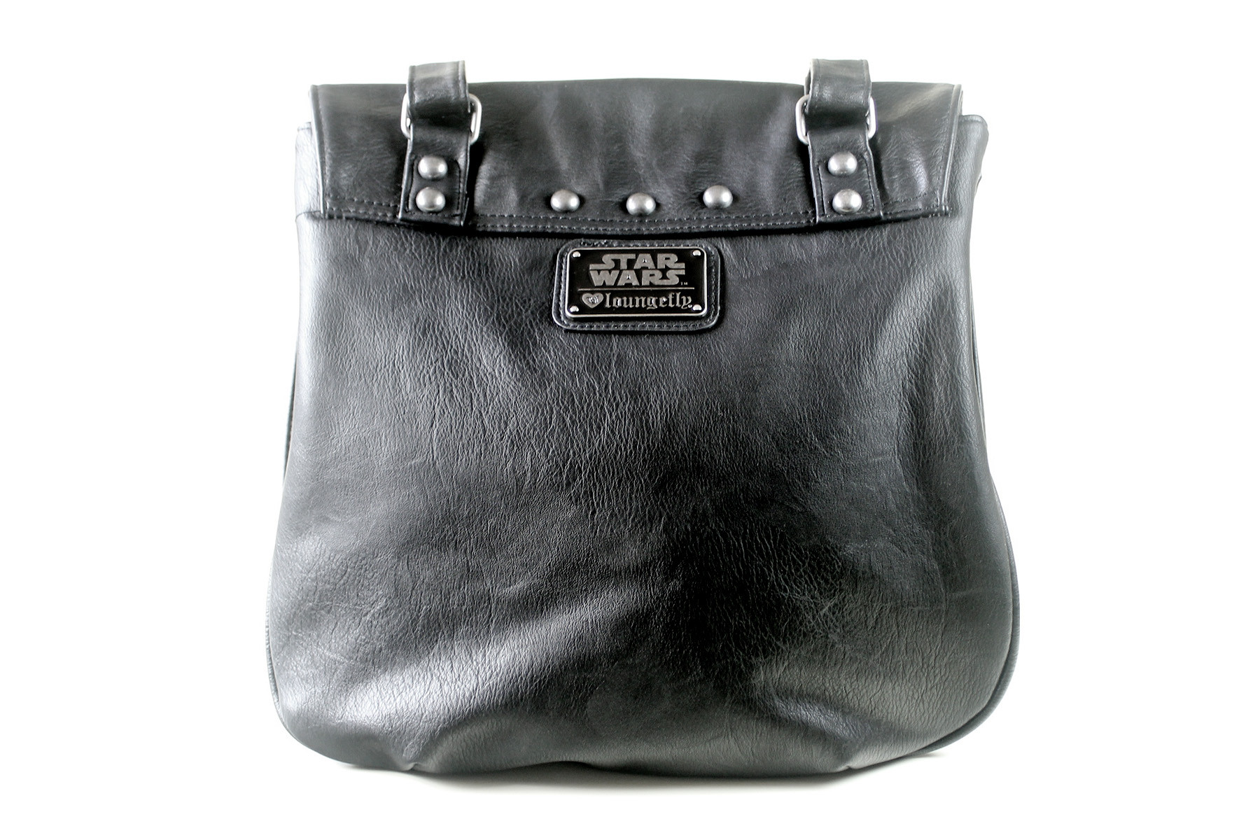 The handles are attached with stitching and 2 gunmetal-tone round studs. The back of the top flap also features 3 of these studs, which is a great detail and adds a bit of a fun edginess to the design. Just below the studs is the classic Loungefly x Star Wars logo plaque, accented with black enamel. This comes covered with a clear protective layer which peels off easily. I love the logo plaques on Loungefly bags, they are a great way to show off who made your fabulous new bag to your friends!
