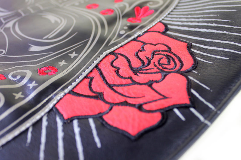 There are 4 red roses on the helmet, fully embroidered in red with black edges – I never thought Darth Vader and roses would go so well together! Darth Vader is always associated with red (Sith lightsaber blades etc), so it a neat way of taking the colour and using it for something floral and feminine. Any other colour (like pink) would have clashed too much with the theme, the red is a perfect accent colour.