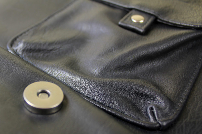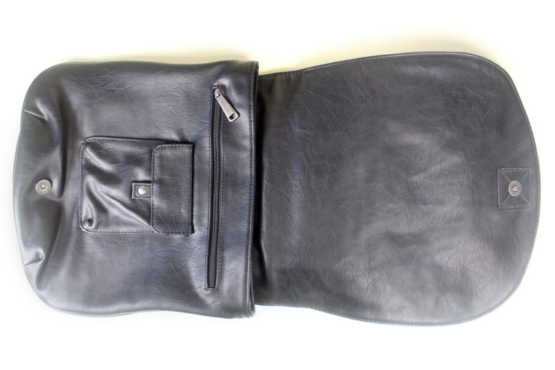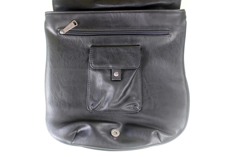 The inside of the top flap is made from the same black faux leather as the exterior (not lining fabric). The bag closes with a magnetic snap closure on the front and flap – it does not zip closed. The magnetic snap closure has a good hold, which is always an important feature for handbags. Under the flap, there are 3 compartments – the large main compartment, a zip-up pocket, and a small pouch pocket with flap.