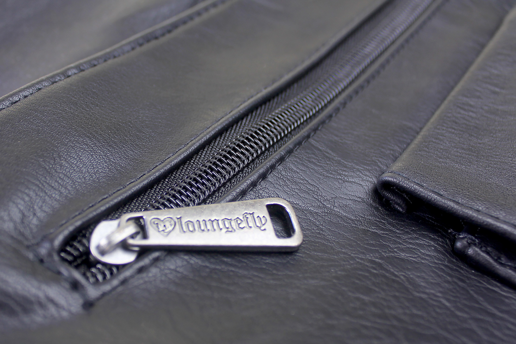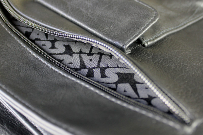 The exterior zip-up pocket features the classic metal Loungefly branded zipper pull – I love the sturdy quality of Loungefly’s zips. This zipper is black plastic, with a gunmetal-tone zipper pull. The pocket measures approximately 23cm across and 16cm deep, and is lined with Loungefly’s classic Star Wars logo printed black lining fabric.