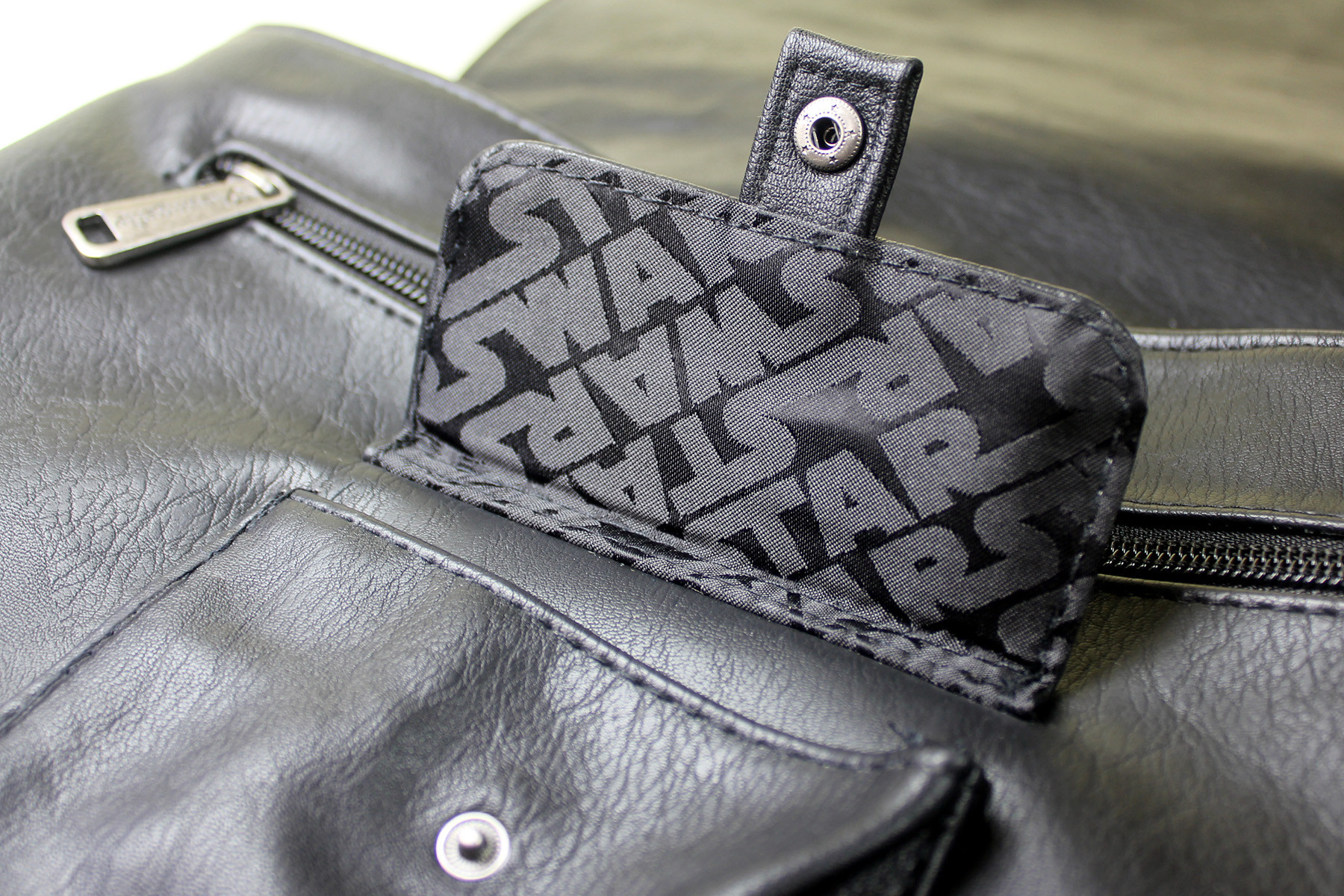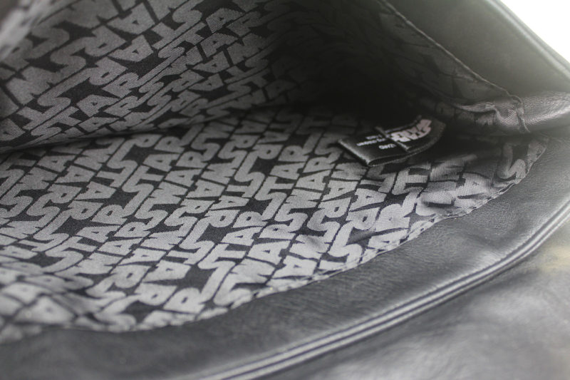The main compartment is also lined with the black Star Wars logo lining fabric. There are no small internal pockets inside this main compartment, as there are already smaller pockets on the outside under the top flap. The main compartment measures approximately 29cm across and 30cm deep, a great size for stashing all your stuff. It can easily fit an iPad (something I always like, my tablet goes with me everywhere), small cardigan, drink bottle etc. The main compartment doesn’t have a flat bottom, but there are stitched darts in the bottom to give the bag width.