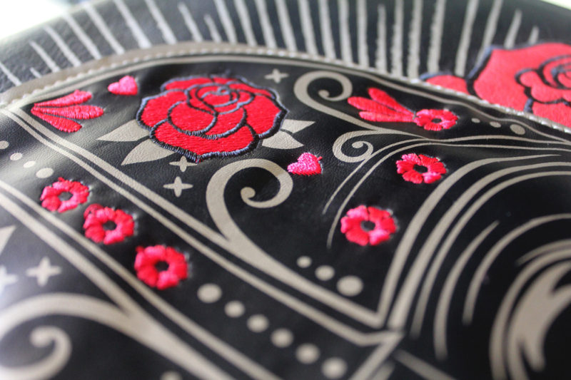 The crossbody bag is made from black faux leather, with a large sugar skull style appliqué of Darth Vader’s helmet on the front. The appliqué features silver printed details, and embroidered details in red and black. The design matches the style used for the Stormtrooper sugar skull crossbody, which I already own – and love! While they are both crossbody bags, the actual shape and style of the bags are different.