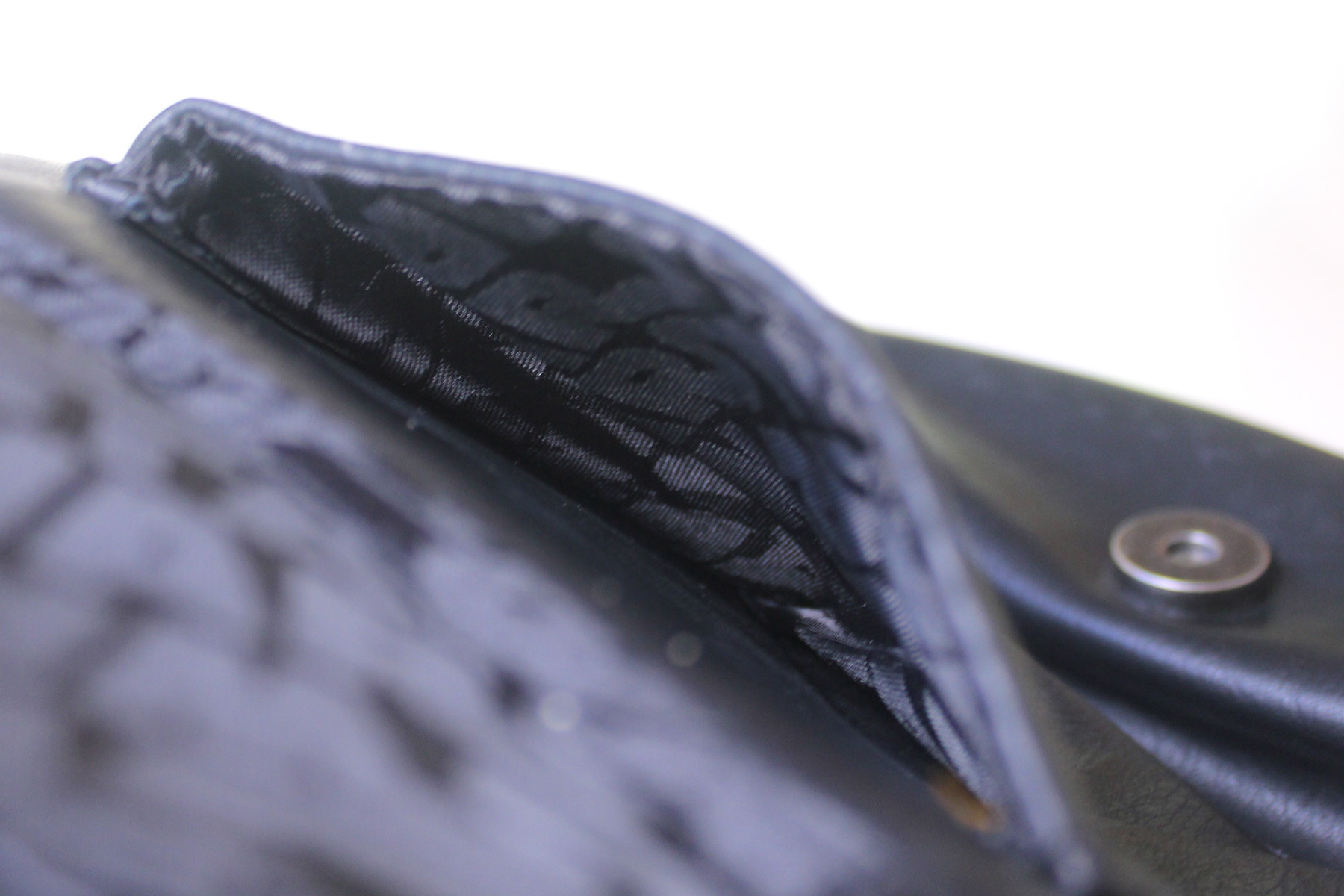 The shoulder strap is made the same black faux leather as the bag, from 2 layers stitched together. The strap also features a sliding shoulder pad, which is made from a slightly stiffer faux leather for structure, with the edges sealed. This is a nice feature, providing extra comfort for when you’re carrying a bit more in your handbag.