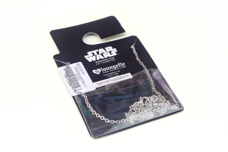 The necklace came packaged on a black cardboard jewelry backing card, with the chain neatly tucked into a clear plastic pocket on the back. The card features the standard Star Wars branding on the front and back, along with the Loungefly logo on the back. Neither the card or the Spencers website note what material the necklace is made from, so I’m not sure.