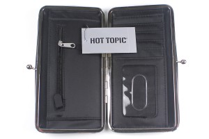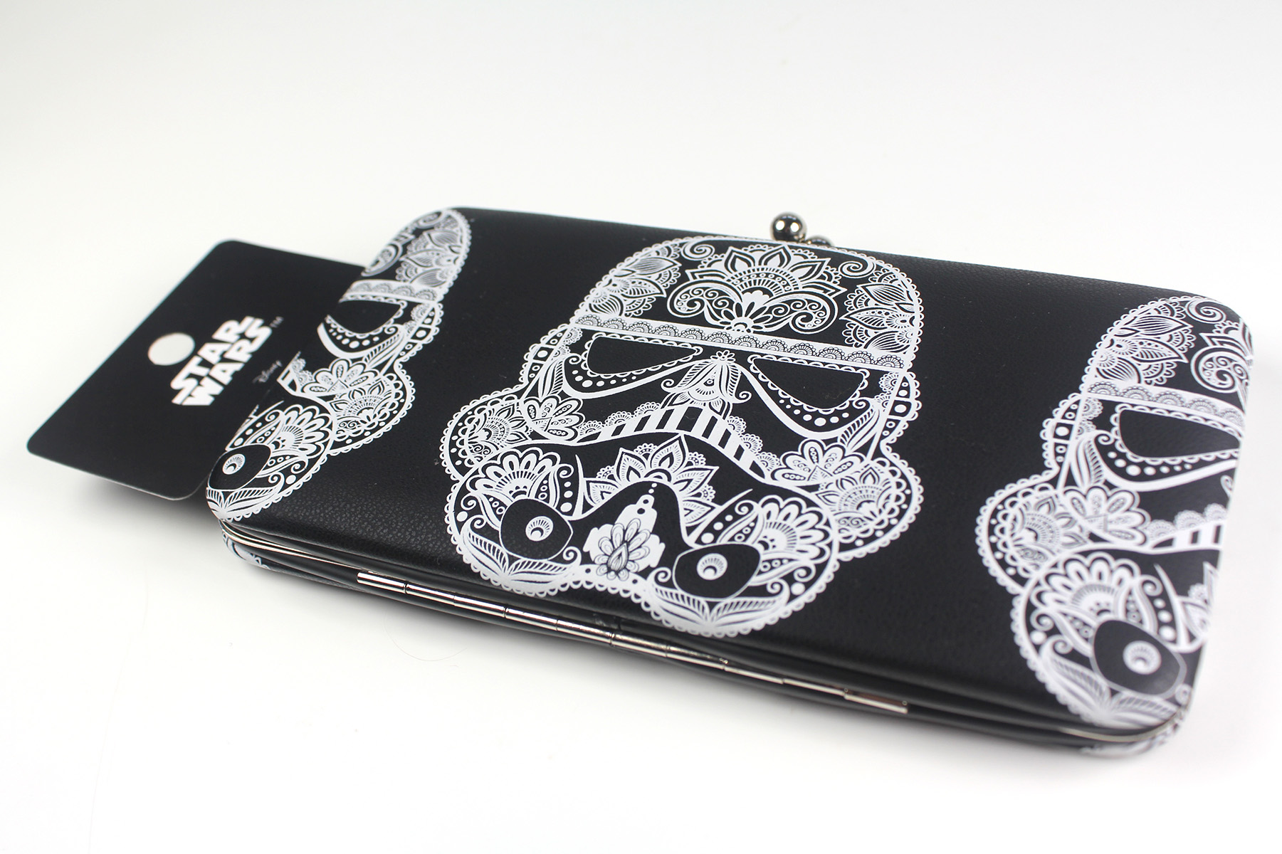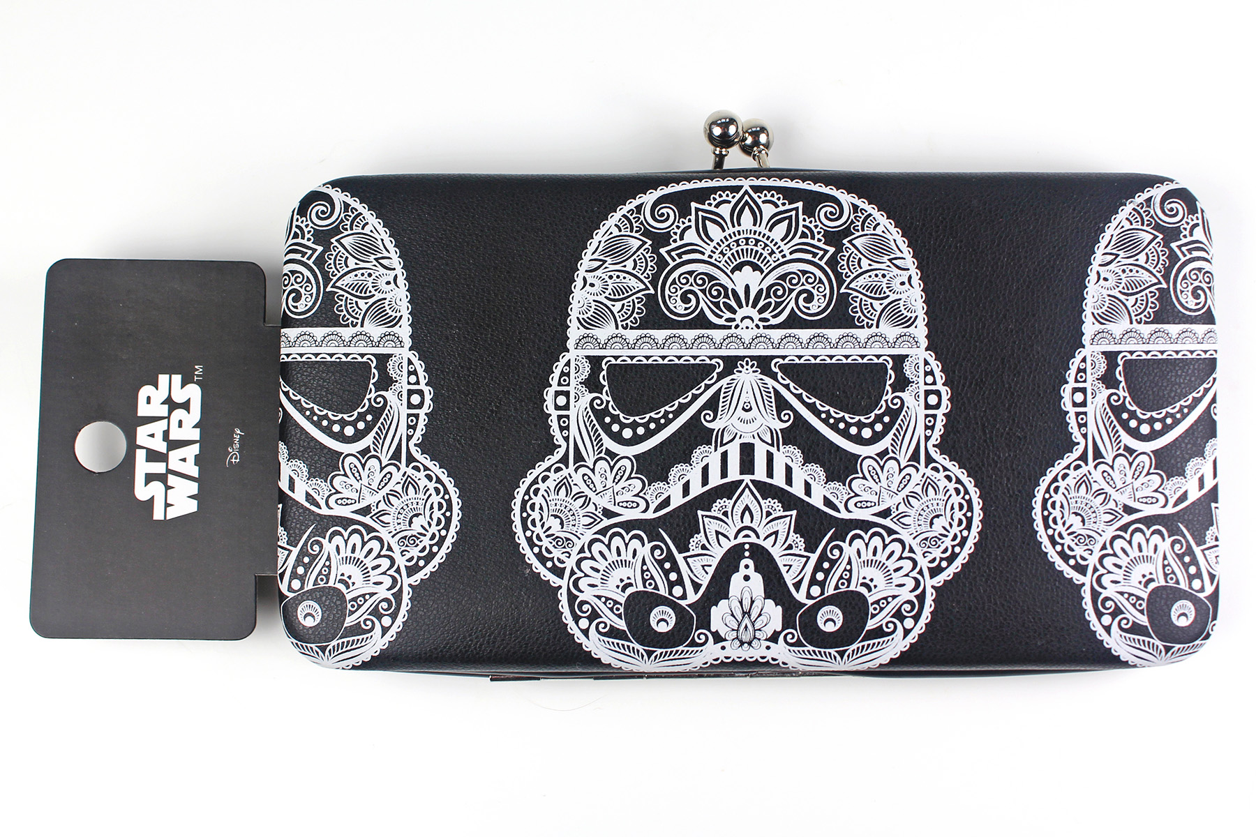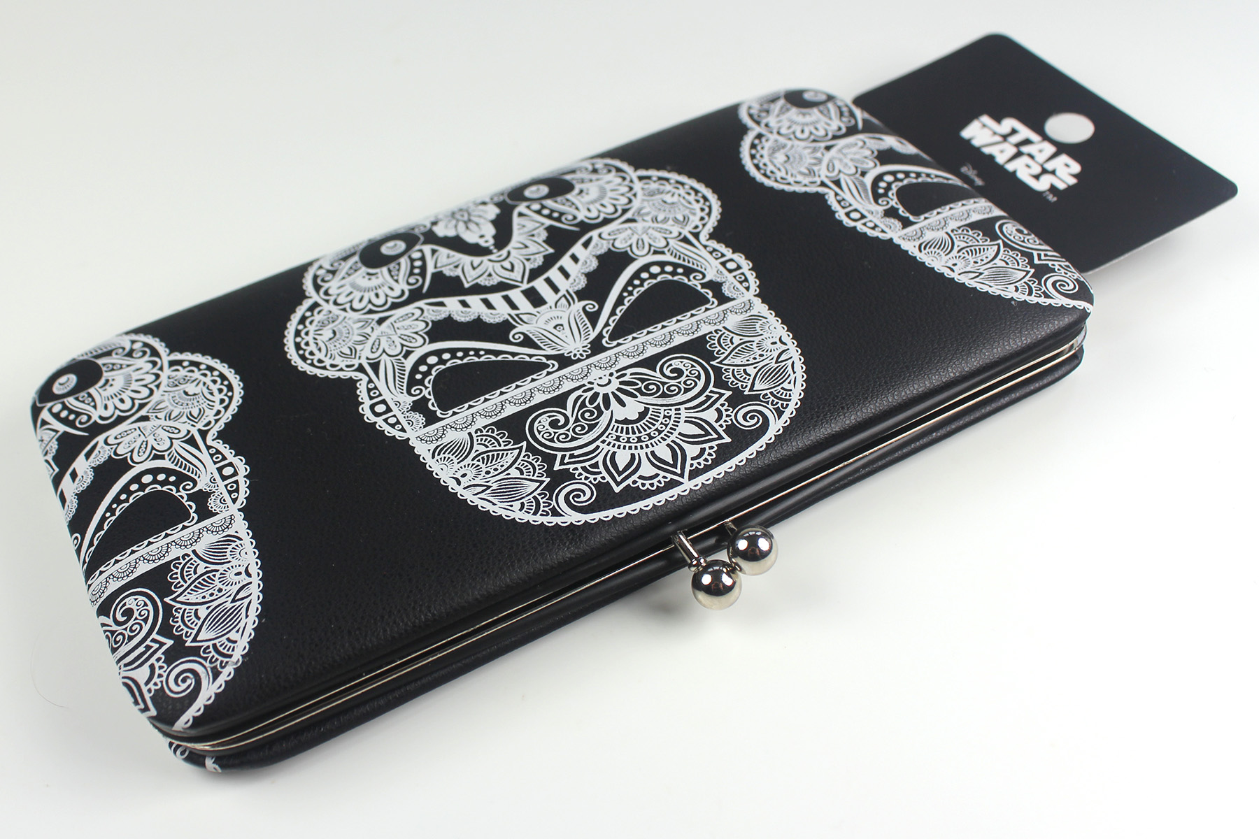 I’m always keen to find out the manufacturing company for items, so I was excited to discover this stormtrooper wallet is made by Loungefly! Usually priced at US$16.50, I bought the wallet on sale from Hot Topic using a ‘Hot Cash’ voucher – it is still available, at the time of writing. Note that the tags seen in the photos are easily removed. It is described as a ‘kisslock hinge wallet’, with a metal frame that clips closed with the two metal ‘pins’ at the top. The outer is black faux leather, featuring a white semi-repeated ‘Day of the Dead’ stormtrooper print. The print design has a lot of fine details, quite floral but still recognizably a stormtrooper. Inside, there is a zip up compartment and bill slot on one side, while the other side has five card slots (one with plastic window) and another bill slot. The wallet measures approximately 18.3cm x 10cm (not including the ‘pins’) x 2cm. Due to it’s slender design, it can’t shut properly if overfilled, but it’s a fantastic wallet – almost too pretty to keep hidden inside a handbag! This is one I’m definitely going to use as an evening clutch, it has a slightly more elegant feel compared to standard wallet designs.