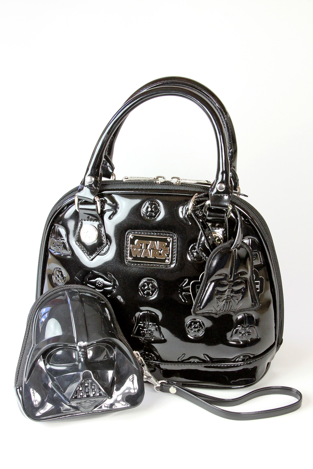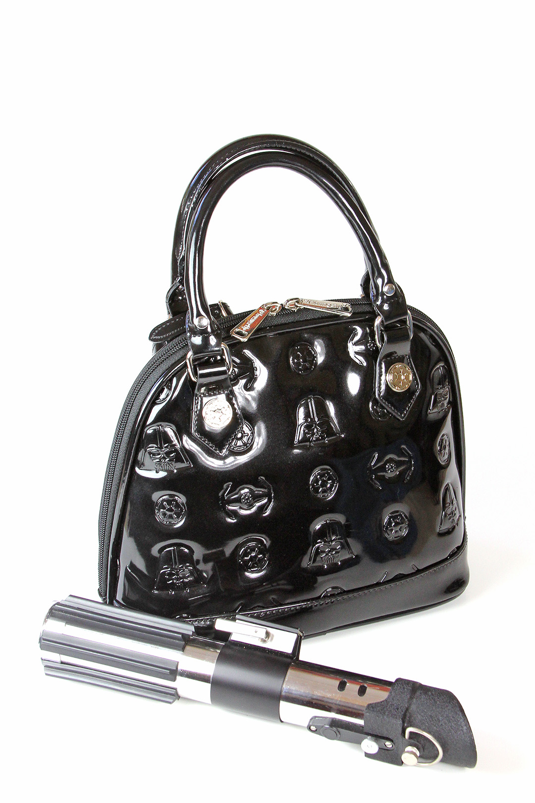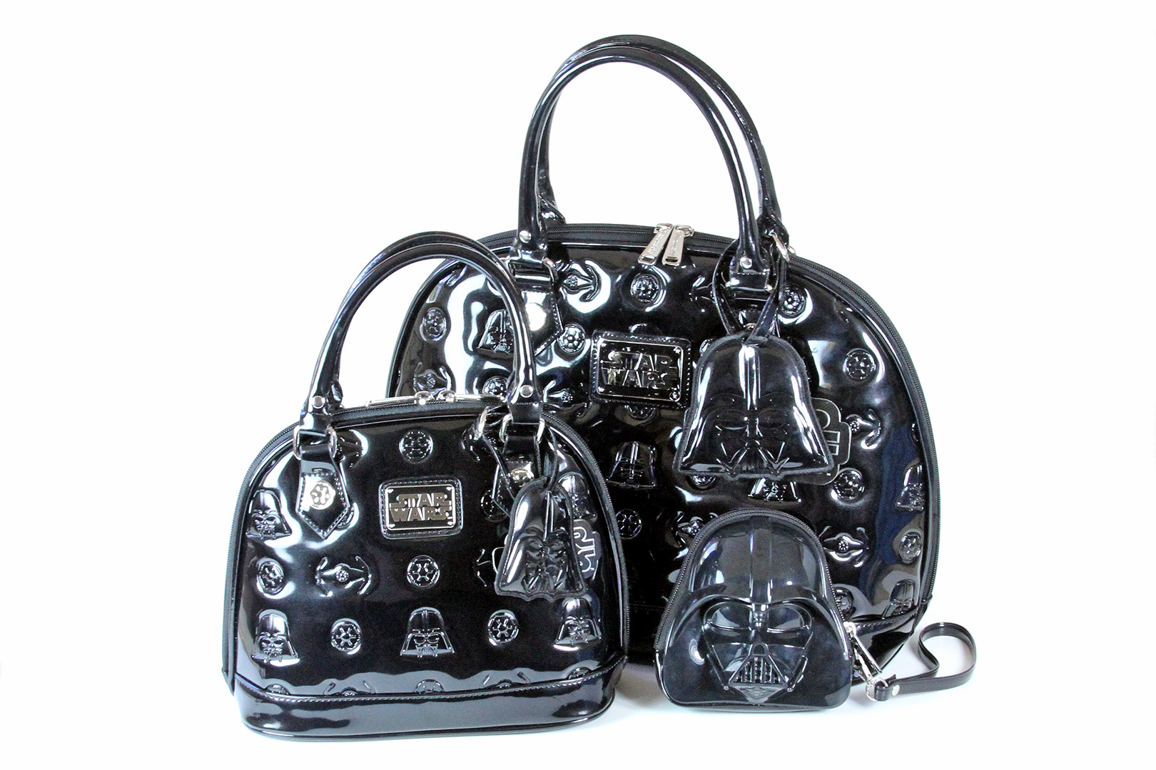 You can see the size difference between the two versions of the Darth Vader bag in my photo below. The removable Darth Vader helmet tags are different sizes also, in scale with the bags. The bottom has four metal stud feet to help avoid scuffing the patent leather surface when placed down. The interior is lined with the same Star Wars logo printed fabric, with two fabric pockets on one side, and a zip-up compartment on the other side. The handles feature the same silver metal Imperial cog studs, one of my favourite details from this collection. Loungefly.com has a price difference of US$15 between the two sizes (US$60 for the mini, US$75 for the standard). While it may not be entirely necessary for me to own two handbags so similar in design, the very noticeable size difference means I use them for very different situations.