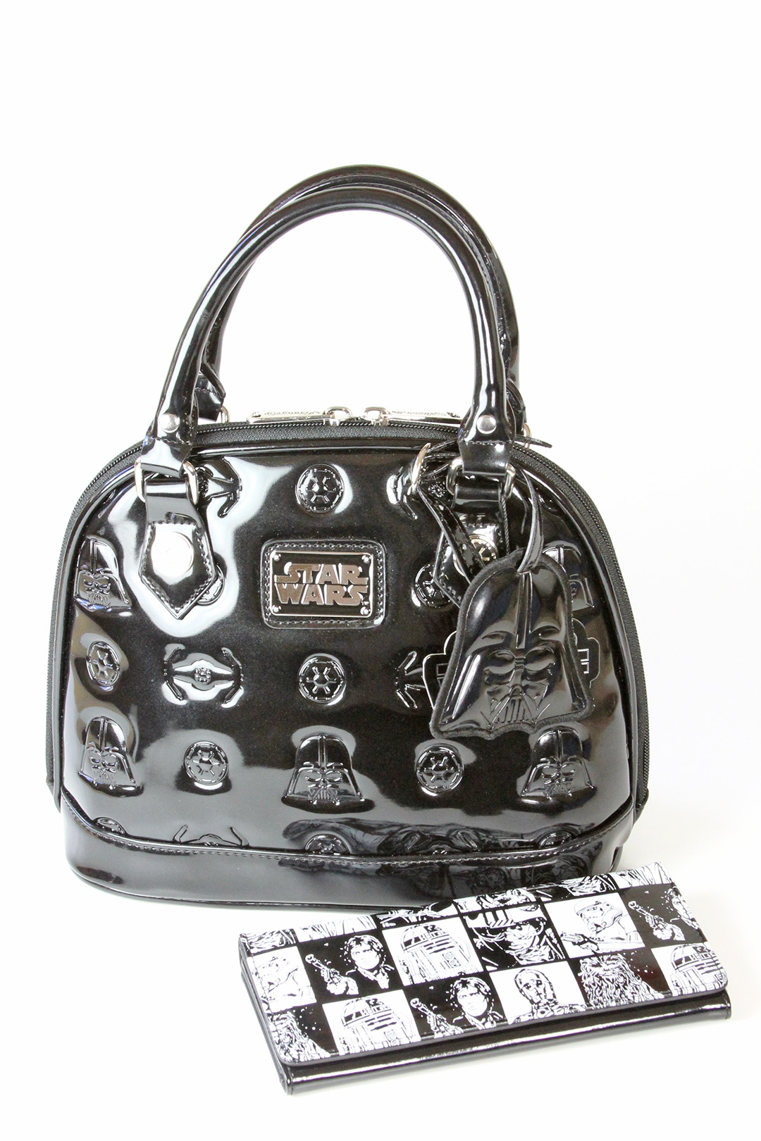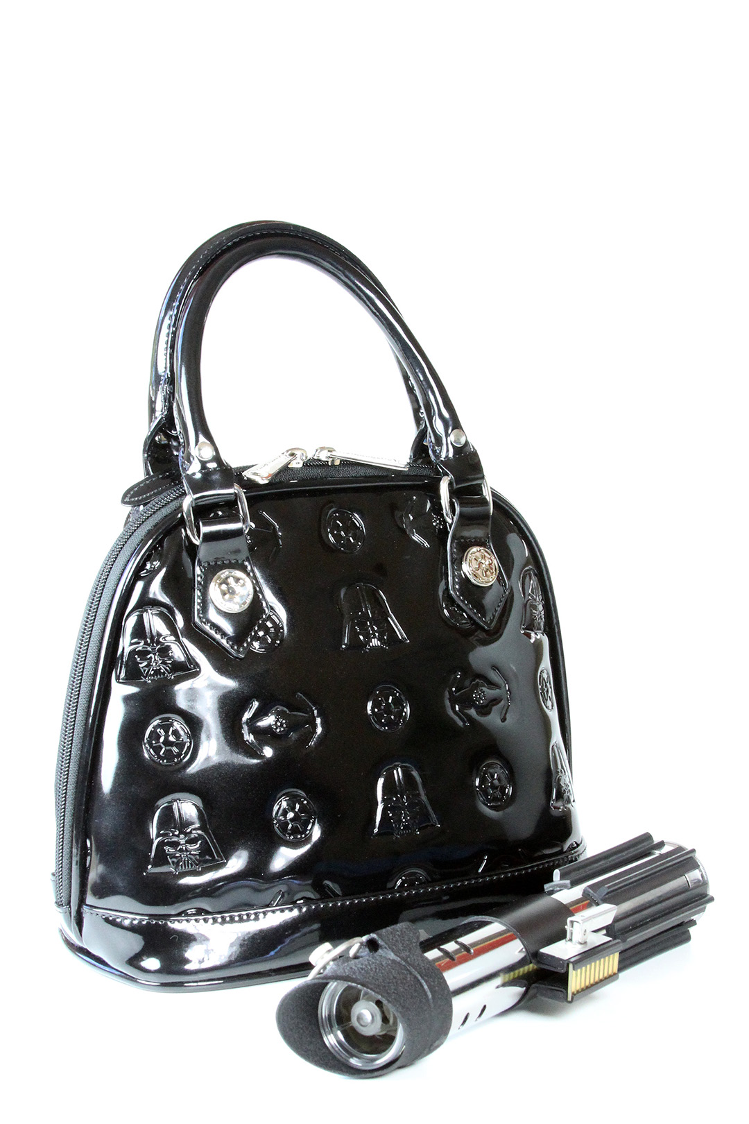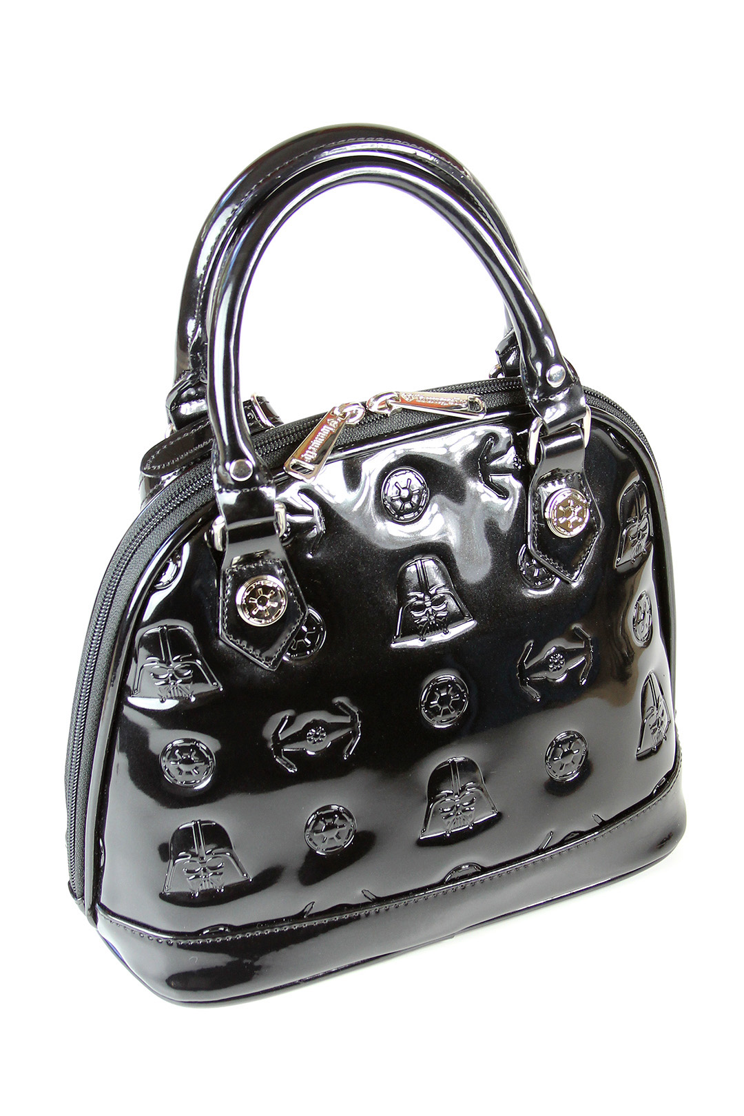 You can see the size difference between the two versions of the Darth Vader bag in my photo below. The removable Darth Vader helmet tags are different sizes also, in scale with the bags. The bottom has four metal stud feet to help avoid scuffing the patent leather surface when placed down. The interior is lined with the same Star Wars logo printed fabric, with two fabric pockets on one side, and a zip-up compartment on the other side. The handles feature the same silver metal Imperial cog studs, one of my favourite details from this collection. Loungefly.com has a price difference of US$15 between the two sizes (US$60 for the mini, US$75 for the standard). While it may not be entirely necessary for me to own two handbags so similar in design, the very noticeable size difference means I use them for very different situations.