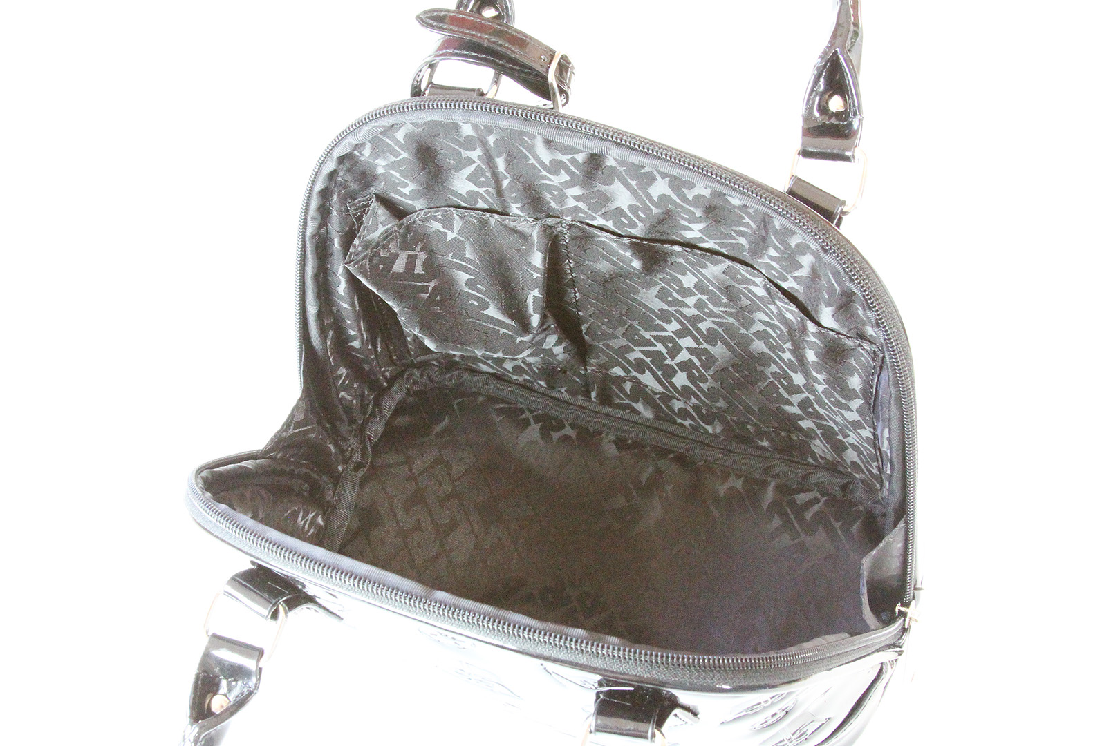 The bag came in it’s own black drawstring dust bag, with the Star Wars logo printed in silver on one side. Again, this bag has a fantastic patent leather shine, embossed with repeating patterns of Darth Vader’s helmet, Imperial logo, and TIE X1 Advanced. The features are all very similar to the larger version, so my photos in this review are more focused on size comparison. Above is a photo of the mini bag with my Rock Rebel comic panel wallet for approximate scale – I haven’t purchased a wallet from the Loungefly x Star Wars collection yet. I have also taken photos with the Darth Vader 3d coin clutch and the R2-D2 handbag from the same collection for comparison. The mini Darth Vader handbag measures approximately 27cm long, 12cm wide and 22cm high – the same measurements as the R2-D2 bag.