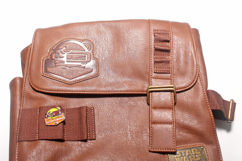 The other real world touches are the antiqued Loungefly x Star Wars logo plaque on the bottom right hand corner, and the collectors pin. The pin is exclusive to the SDCC version, and is completely removable. The pin has a standard pin backing, with the post inserted through webbing, so you can take it off and wear it on other items/garments if you wish. The enamel pin features the same design as the patch, of Rey on her speeder – this time with the text ‘ Collector’s Edition 2016’ underneath, and the Resistance ‘starbird’ symbol. The bright colours of the pin stand out against the brown tones of the rest of the bag, so I’m probably going to remove mine to keep with my other pins.
