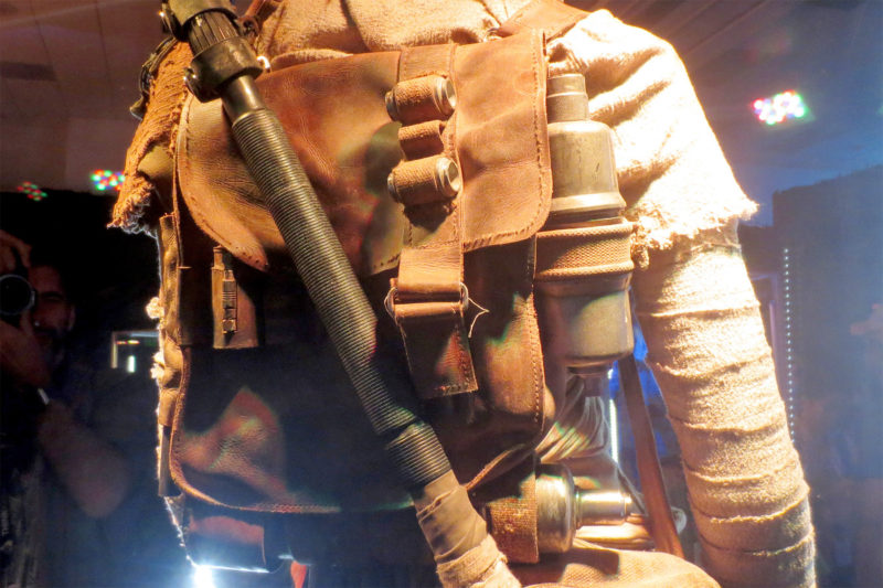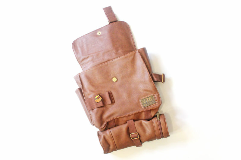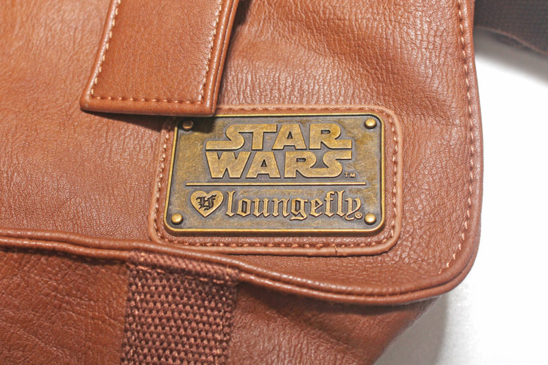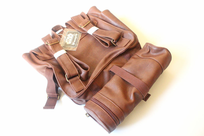 The Loungefly x Star Wars Rey ‘cosplay’ backpack is designed after Rey’s backpack seen in The Force Awakens. The original bag was on display as part of Rey’s screen used costume at Celebration Anaheim in 2015, which I was fortunate enough to see in person. There are obviously a few changes made to the Loungefly version, such as the lack of metal ‘greeblies’ and cannisters – though the loops and buckles are included, so you can always add extra items to your bag if you like. There are also a few ‘real world’ touches to the Loungefly version, such as the embossed patch of Rey on her speeder, and the metal Loungefly x Star Wars logo plaque.