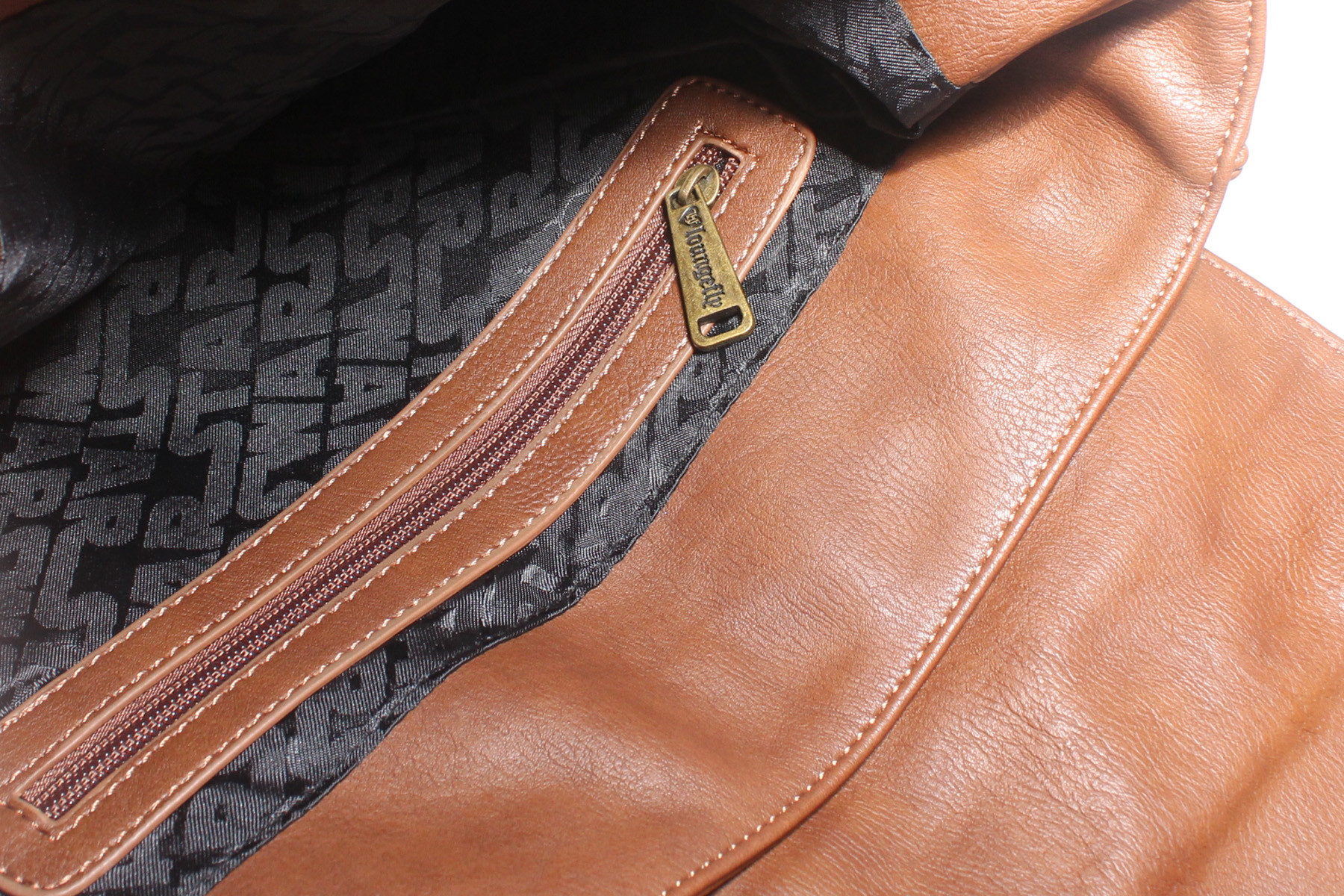 Inside the main compartment, there is a zip-up pocket, accented with brown faux leather trim, with brown plastic zip and metal zipper pull. The zip measures approximately 19cm long – the pocket is a great size for storing your phone, keys etc.