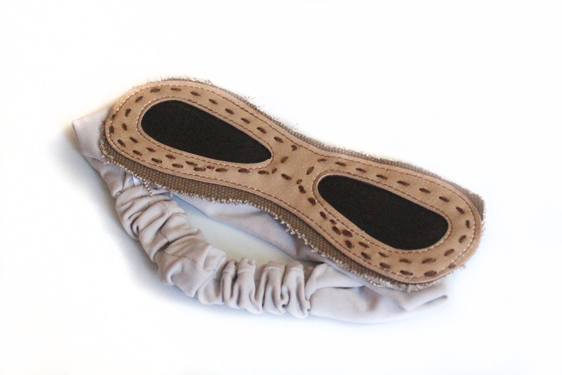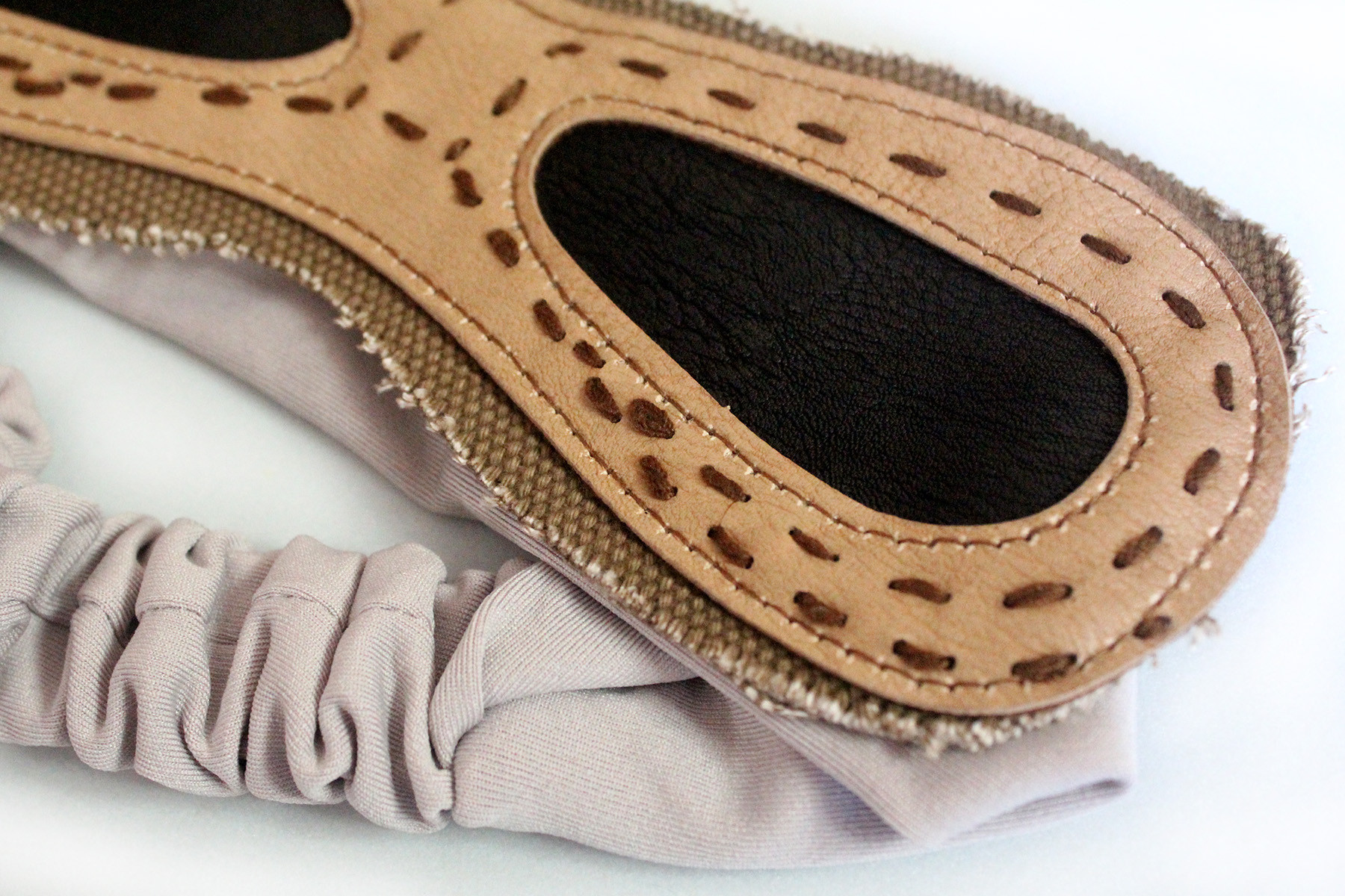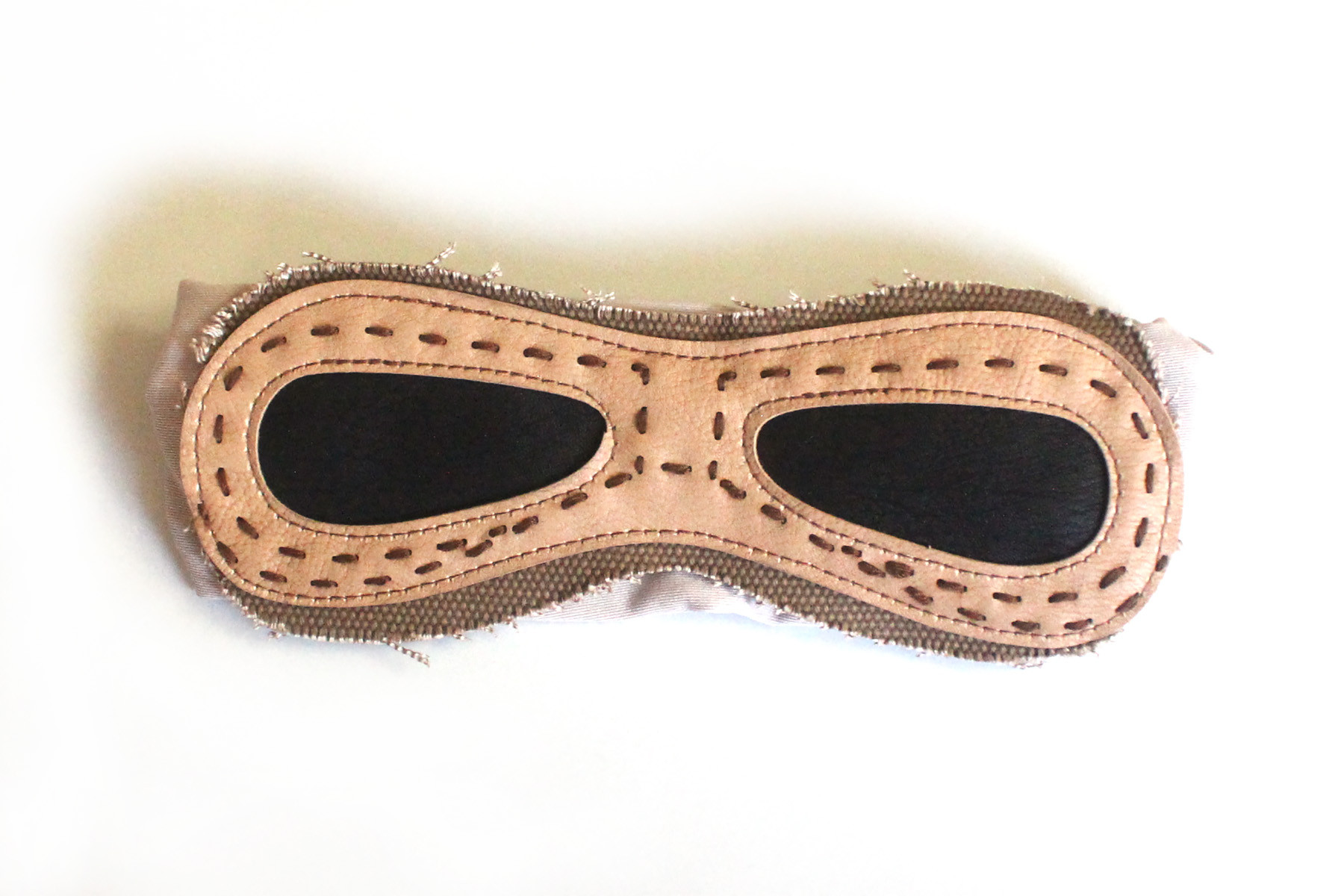 The goggle portion is sewn from 3 layers – a bottom layer of raw edged fabric, black faux leather for the lenses, and a top layer of light brown faux leather with dark brown ‘hand stitching’ detail. The goggles are attached to the headband in 6 places with hand stitching (2 at each end of the goggles, and 2 in the middle). These can be easily cut if you desired, to attach the goggle portion to a different headband. The goggle portion measures approximately 22cm across, and 7.8cm high (at the widest parts).