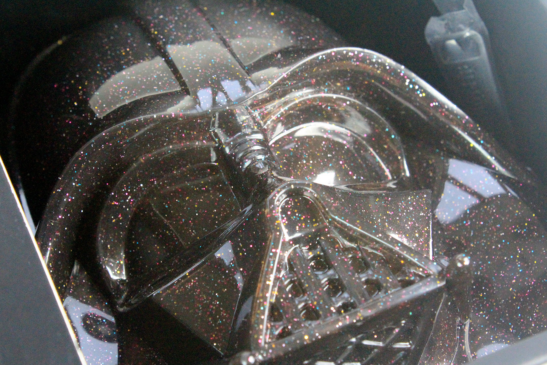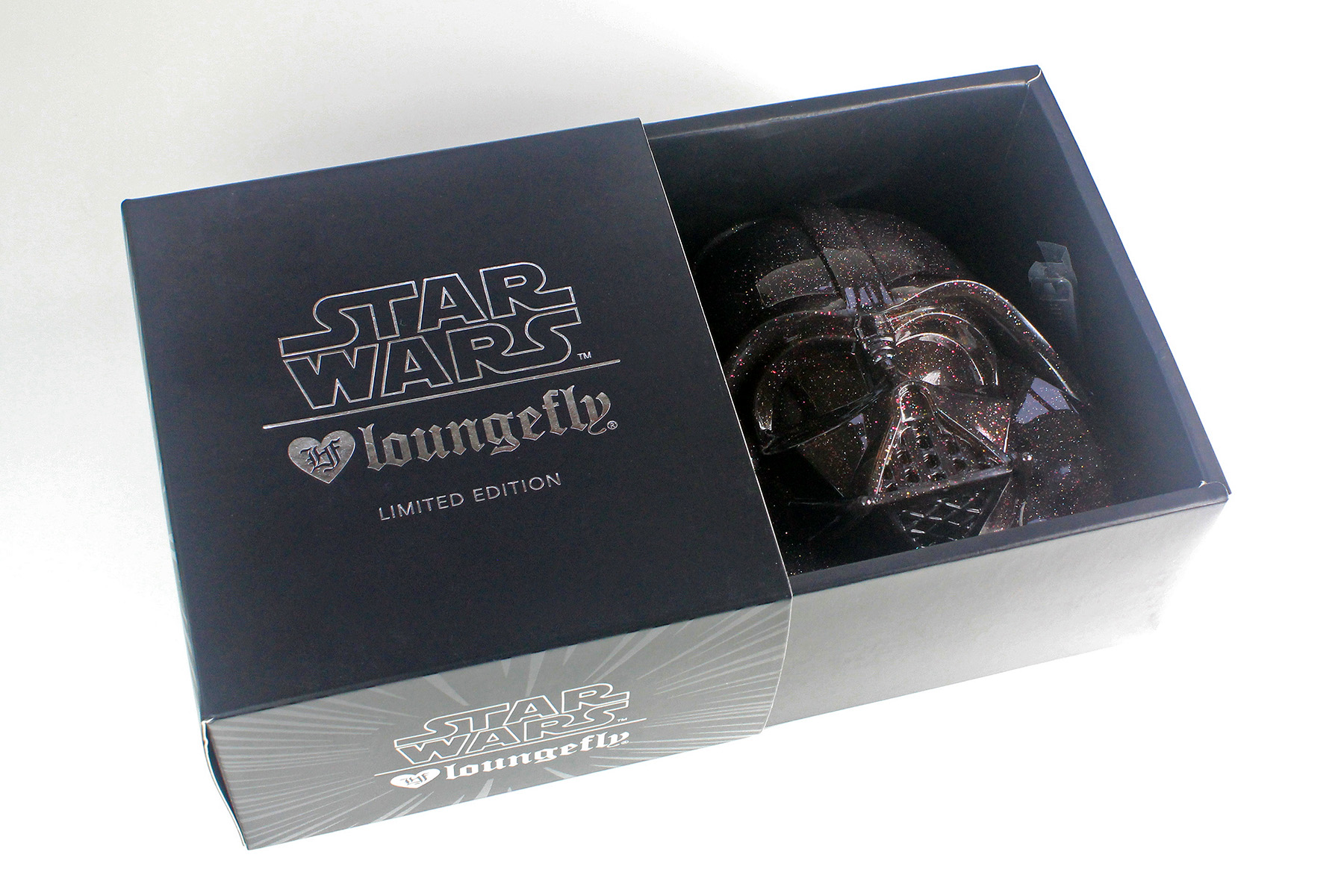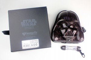 For San Diego Comic Con 2015, Loungefly released two exclusive Star Wars coin purses. The first was a glitter version of the standard black Darth Vader coin purse (reviewed here), the second was a pink version of the white Stormtrooper coin purse that is coming soon (as seen in earlier preview photos). Limited to 600 of each, the coin purses came with their own special black box, noting their edition size. The coin purses were priced at US$35 each, sold direct from Loungefly’s booth at the convention. I reviewed the pink Stormtrooper coin purse earlier – now it’s time to take a closer look at the glitter Darth Vader coin purse.