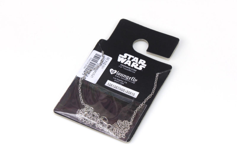 The necklace came packaged on a black cardboard jewelry backing card, with the chain neatly tucked into a clear plastic pocket on the back. The card features the standard Star Wars branding on the front and back, along with the Loungefly logo on the back. Neither the card or the Spencers website note what material the necklace is made from, so I’m not sure.