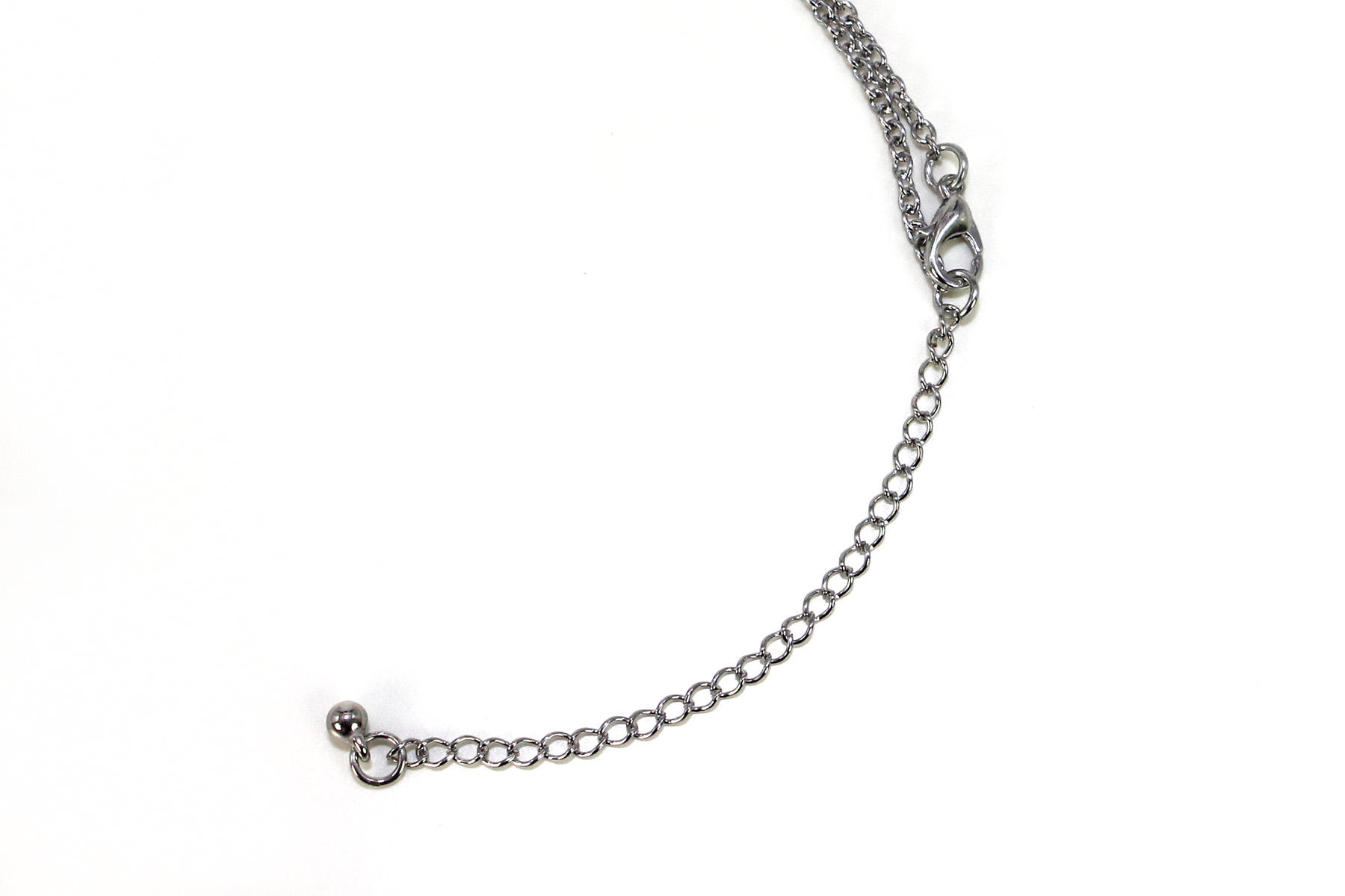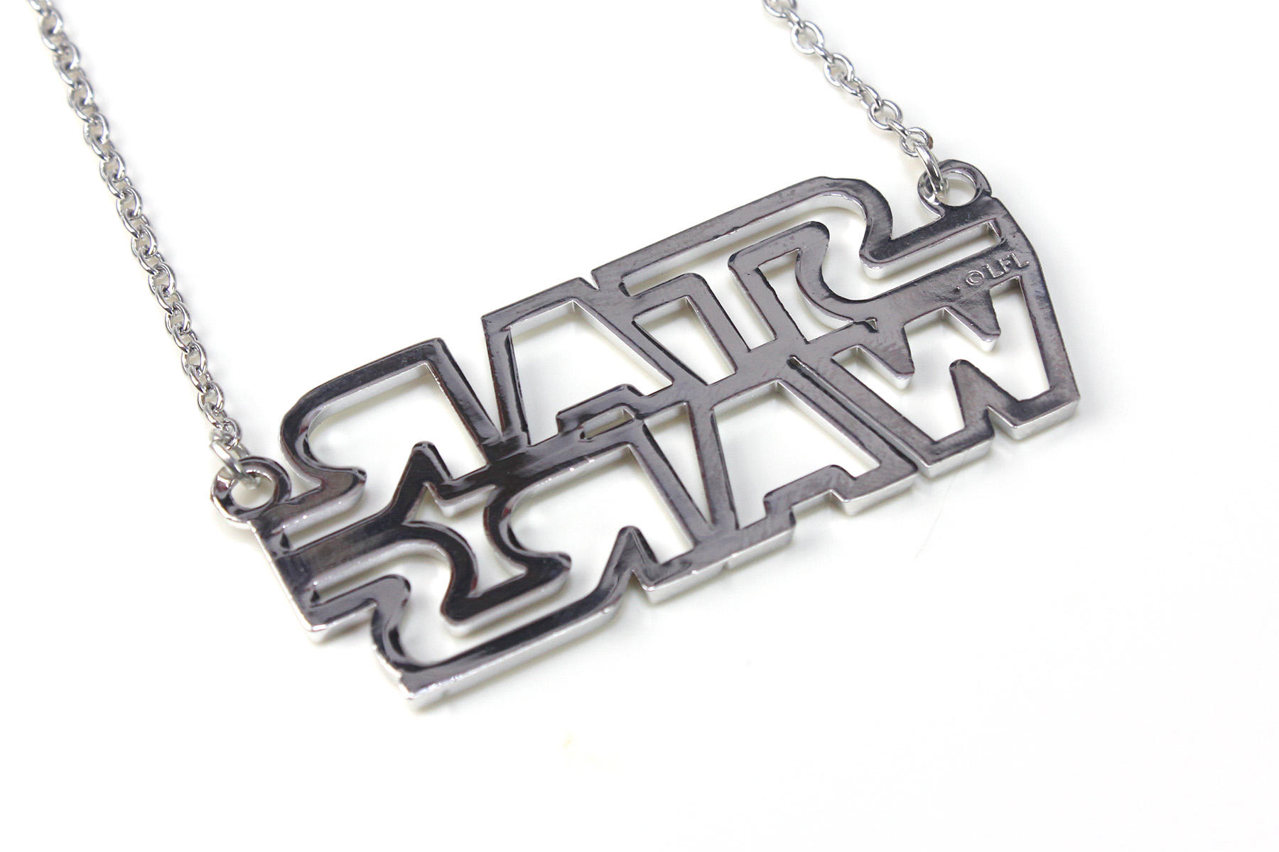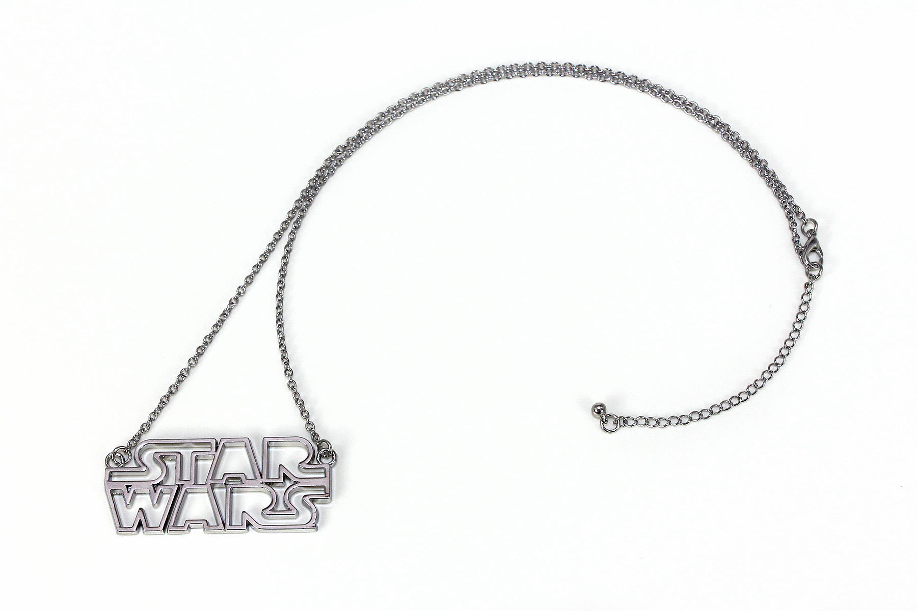 The necklace features a Star Wars logo pendant, with cut-outs. The pendant is hung from two lengths of chain that attach to the pendant by a ring at each upper corner of the pendant. I like two-chain necklaces – ‘landscape’ oriented pendants tend to swing too much to remain level when worn, so this method ensures it sits nicely. I did notice that the lower edge/line at the bottom of the last ‘S’ continues just a tiny bit further, which isn’t there on the first ‘S’- this doesn’t appear in the standard Star Wars logo, so perhaps it’s just a little design feature?