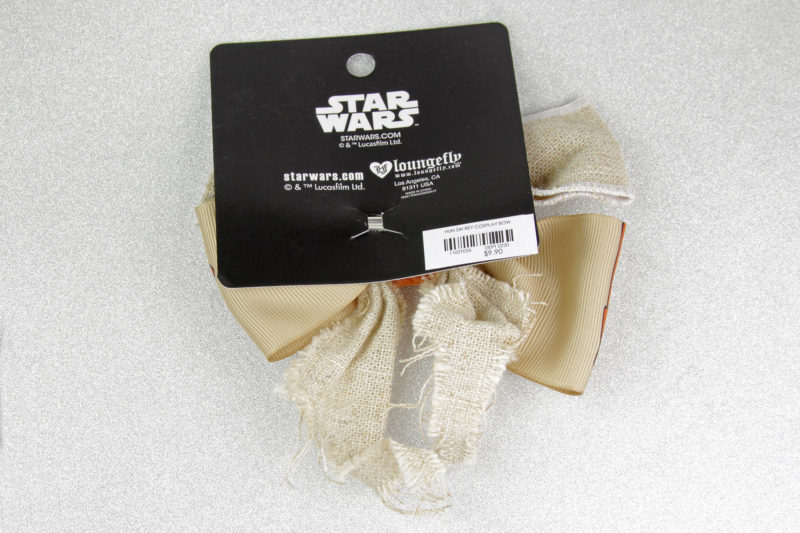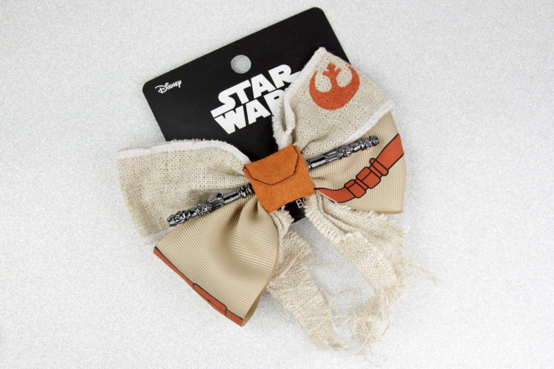 This hair bow is a cute accessory for any Rey themed outfit. The fabrics and details capture Rey’s Jakku outfit very well – the quarterstaff is so cute in miniature scale! I hope Loungefly makes a hair bow themed on Rey’s new jedi training outfit (complete with lightsaber), and also other female Star Wars characters like Queen Amidala!