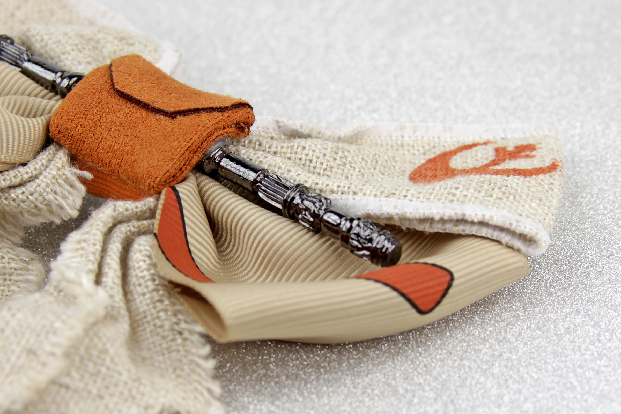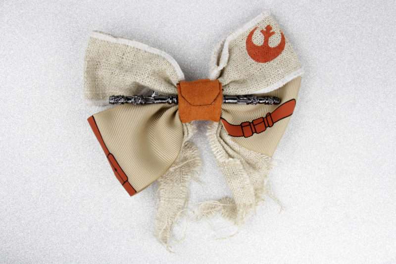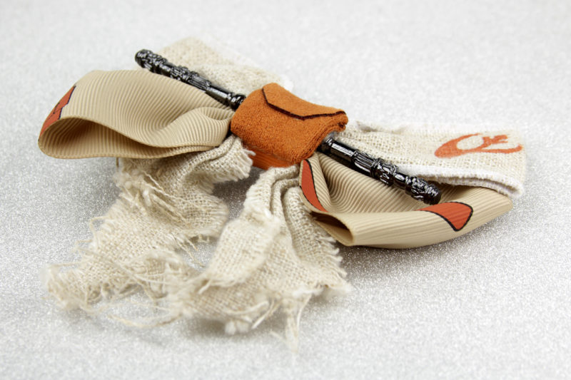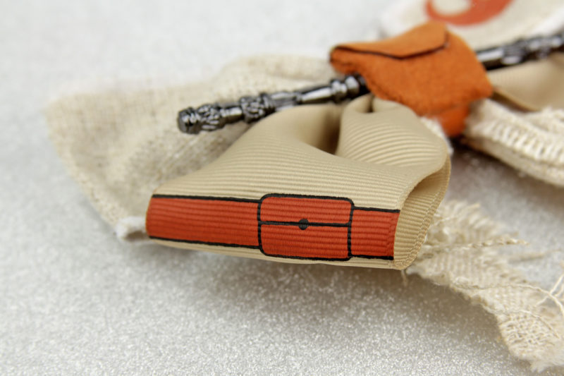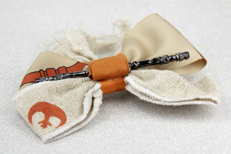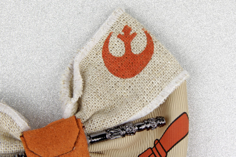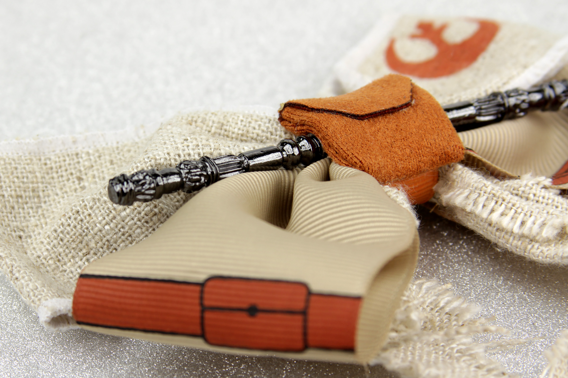 Three of the bow loops feature printed details – the right top loop features the Resistance ‘starbird’ symbol printed in a rust-brown colour, while the bottom two ribbon loops feature printed details resembling belts and pouches. The printing on the ribbons is especially neat and tidy, with black border lines to define the details.