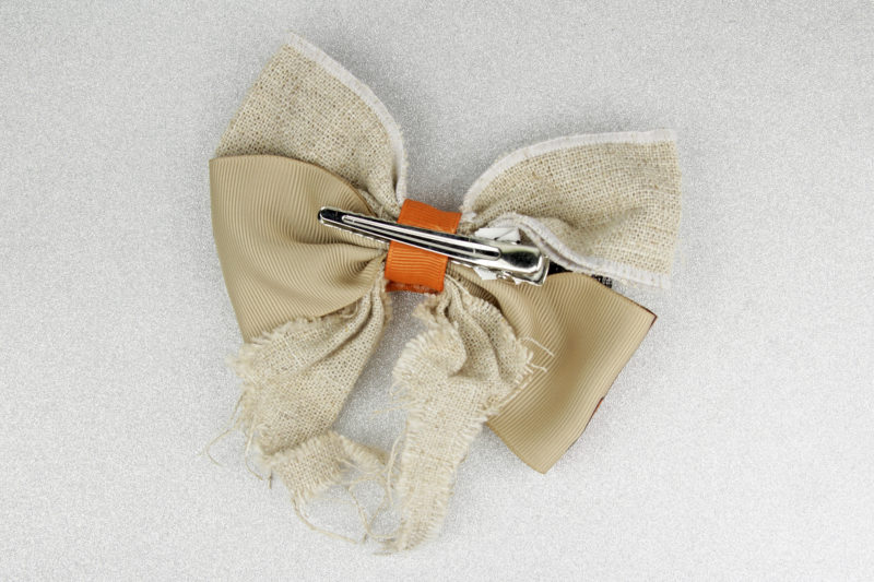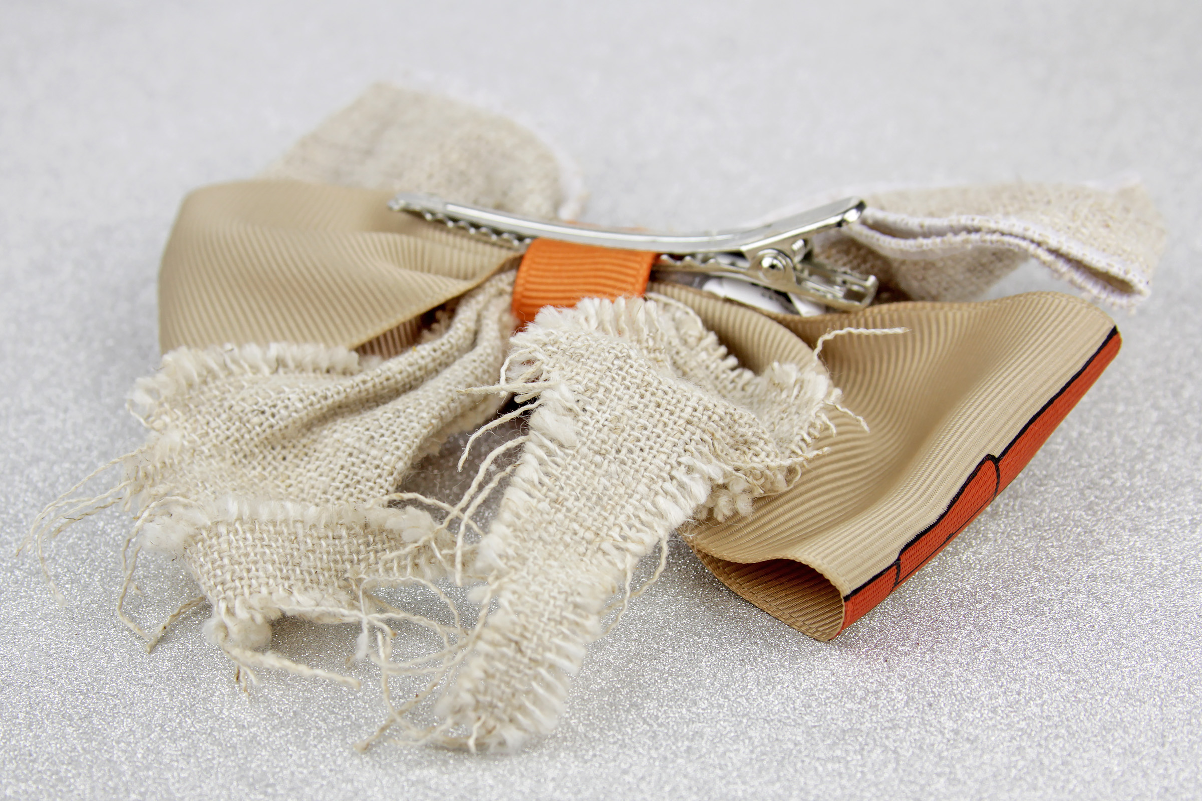 The hair bow features four loops, and two tail strands. The loops are made from two different fabrics – the top loops are made from a cream colour burlap-type fabric, while the bottom loops are made from a beige colour ribbon. The tails are made from the same burlap-type fabric as the top loops, with raw edges. These tails resemble the long fabric sashes of Rey’s costume that hang down around her legs. Due to the frayed edges, I handle this part with care, to avoid loosing too many threads.