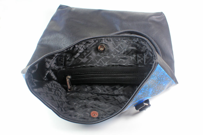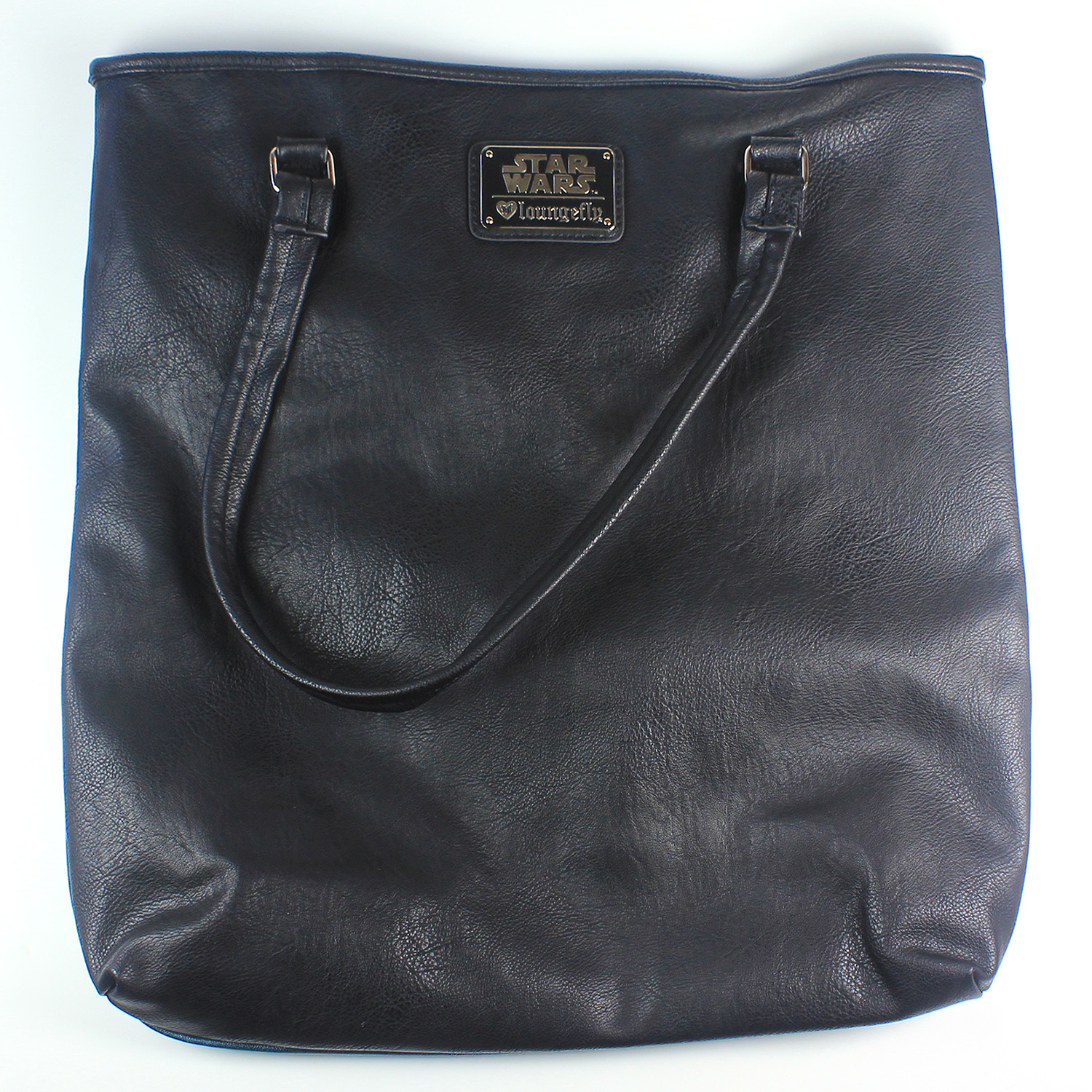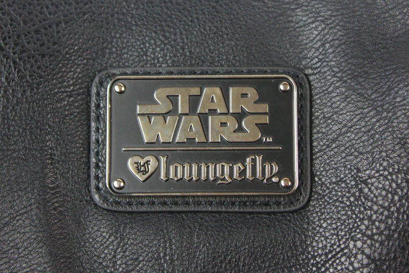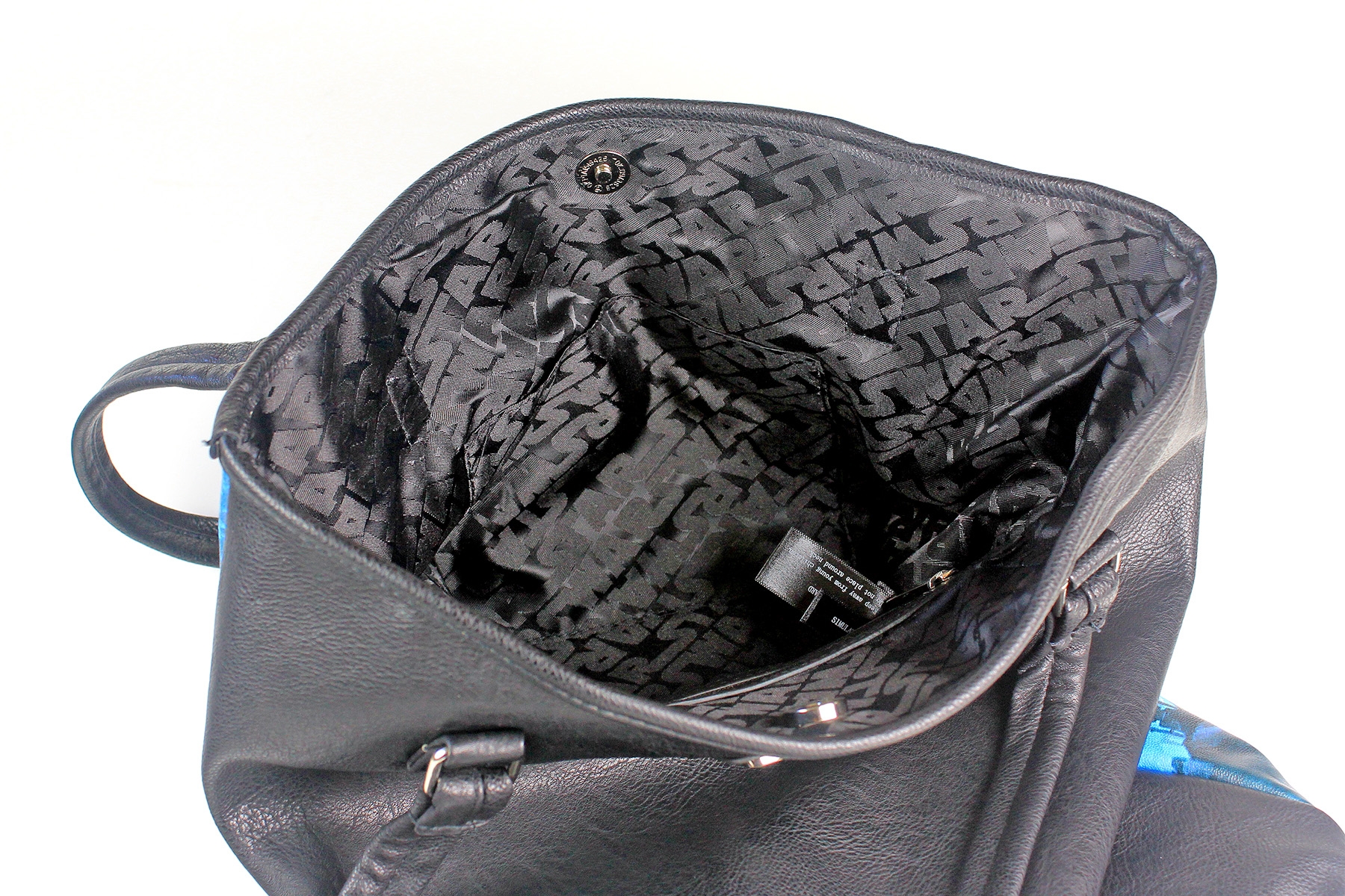 The bag is made from faux leather, with the front image printed directly onto it. I love the vibrancy of the artwork, it works fantastically on the bag. The print quality is really nice, even up close. The bag features the same Loungefly x Star Wars collection details – the enamelled metal logo plaque on the back, the interior zipper pull features the Loungefly logo, and the interior is lined with black printed Star Wars logo fabric. I love the spaciousness of this bag, I can fit so much in it. Inside there are two pockets – one side has an open fabric pocket (approximately 22cm x 16.5cm), the other side has a zipper pocket (approximately 20cm x 15cm). The bag closes with a magnetic snap closure, with the top edge bound with the same faux leather fabric as the exterior. The straps are also sewn from the same black faux leather, attached to the bag with square silver rings.