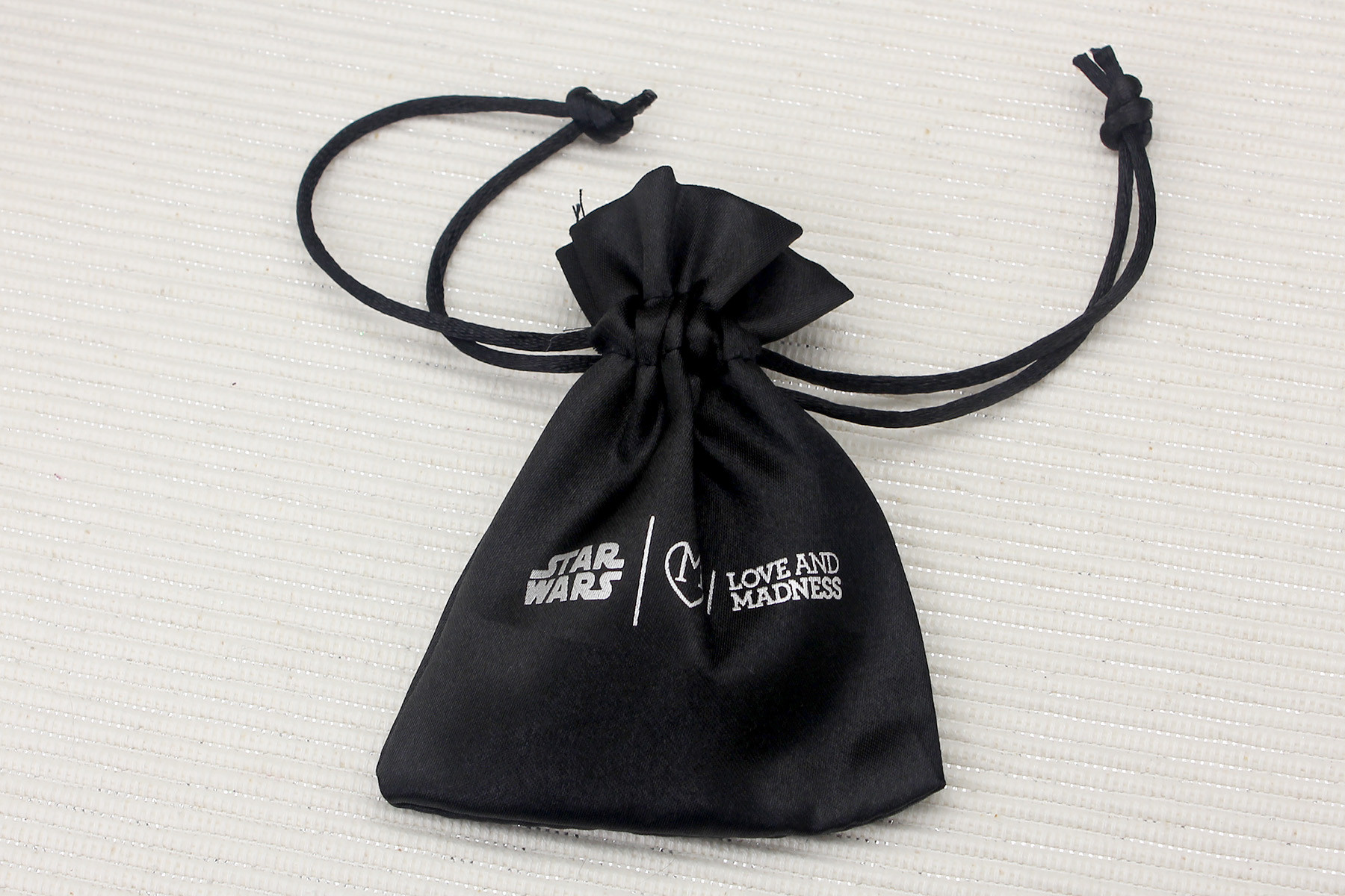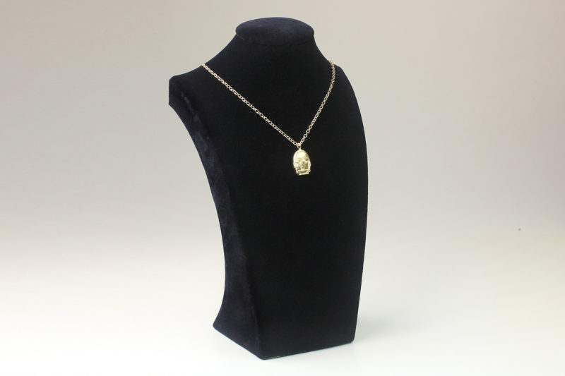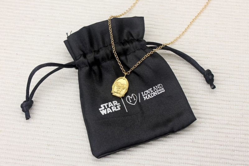 The necklace came packaged in a black satin drawstring bag, with the Star Wars and Love And Madness logos printed in silver on both sides. This is a lovely presentation, perfect for giving as a gift – or as a little treat for yourself! š The necklace itself features a fine gold-tone chain with a pendant of C-3PO’s head. The droid’s facial details are raised, rather than printed or etched – the raised surfaces really catch the light.