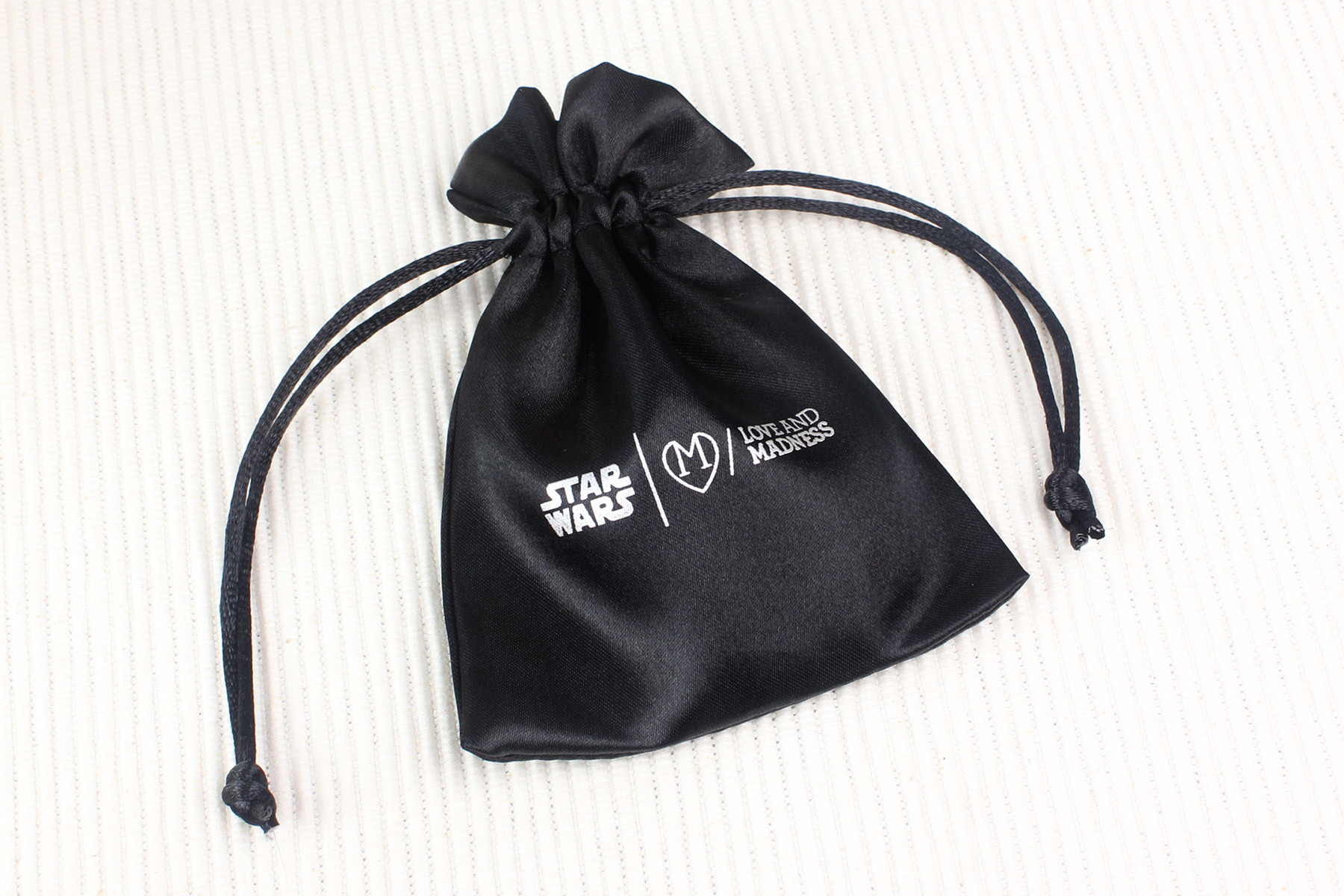 The bracelet came packaged in a black satin drawstring bag, with the Star Wars and Love And Madness logos printed in silver on both sides. This is a lovely presentation, perfect for giving as a gift – or as a little treat for yourself! The bangle itself is made from a silver-tone straight edged band, with the text ‘Star Wars’ spaced across the gap.