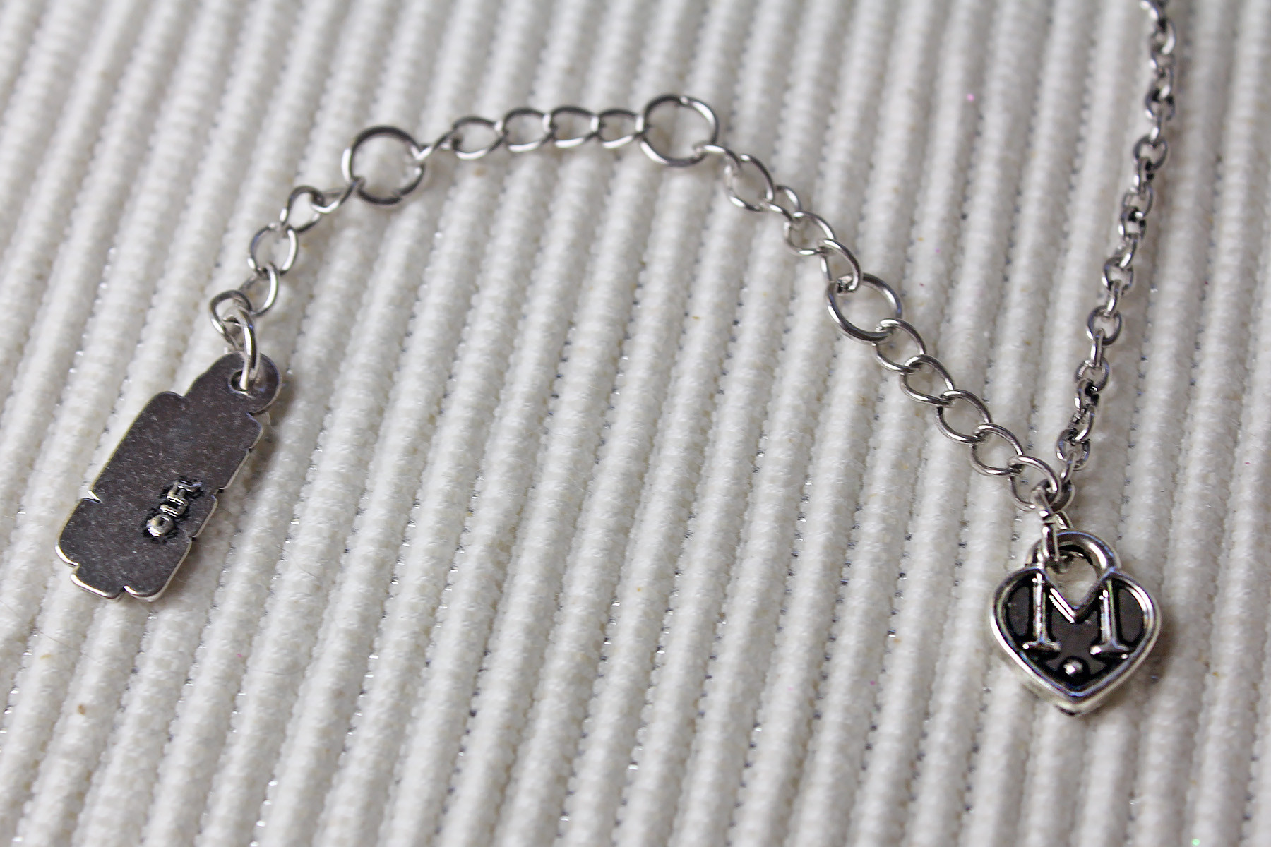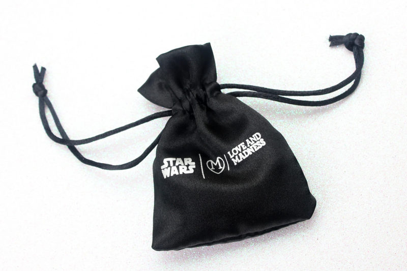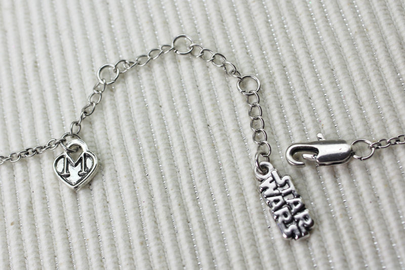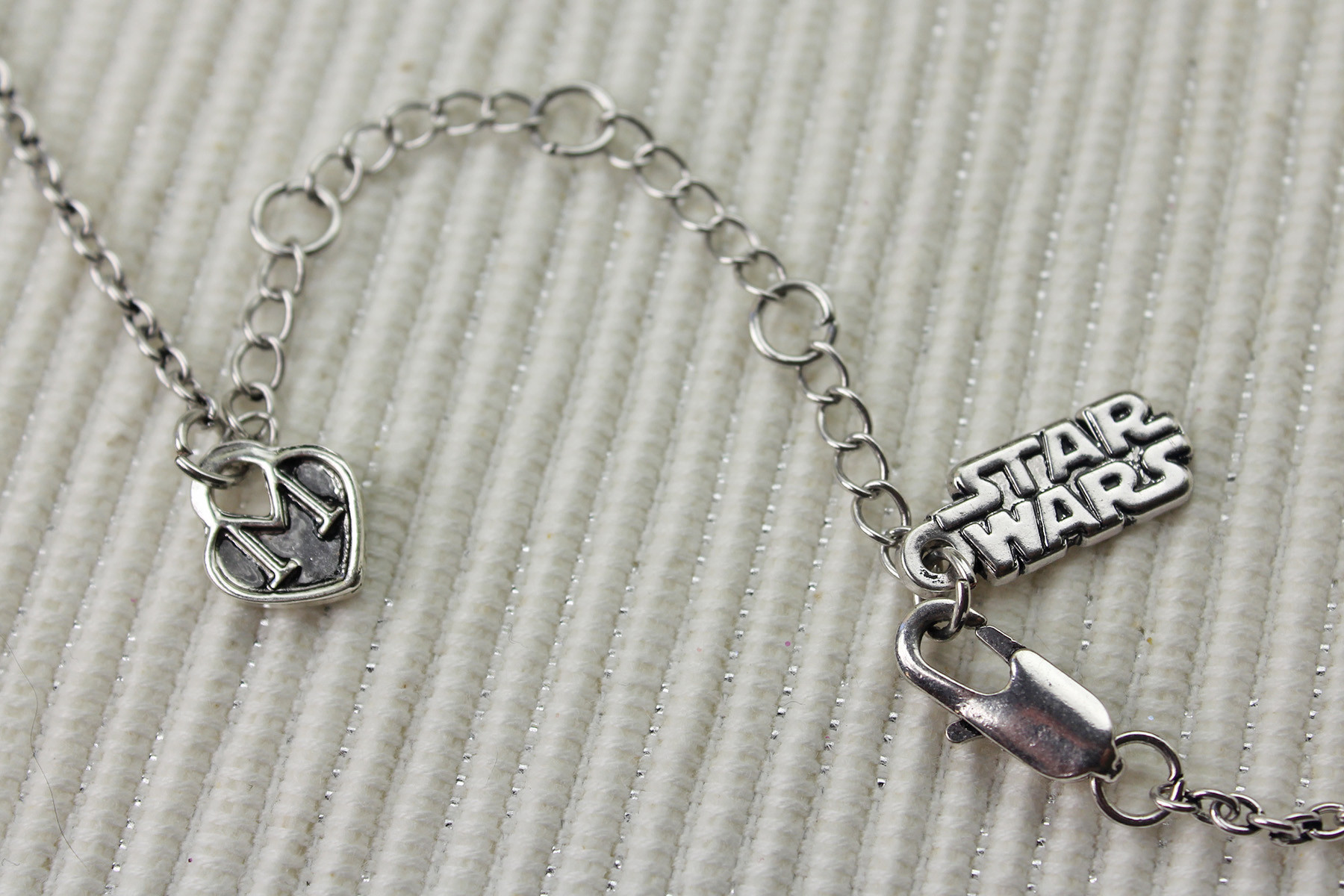 The necklace chain measures approximately 81cm in length, with a further 7.5cm of adjustment chain. The clasp is a silver-tone lobster-style clasp – I really like the shape Love And Madness uses for their necklace clasps. The adjustment chain features 2 small silver-tone pendants – a small ‘heart’ shape pendant with the letter ‘M’ (the logo for Love And Madness), while the end of the adjustment chain features a small Star Wars logo pendant.