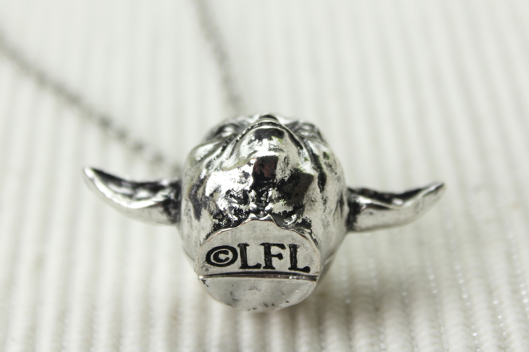 The pendant is made in 2 parts, so there is a small seam line around the back – this isn’t really seen when worn, and certainly doesn’t detract from the fantastic sculpt. The underside features the standard Lucasfilm copyright mark ‘© LFL’, noting this is a licensed item. The silver-tone finish is quite shiny – it picks up nearby colours (you can spot some green reflected on the surface in my photos).
