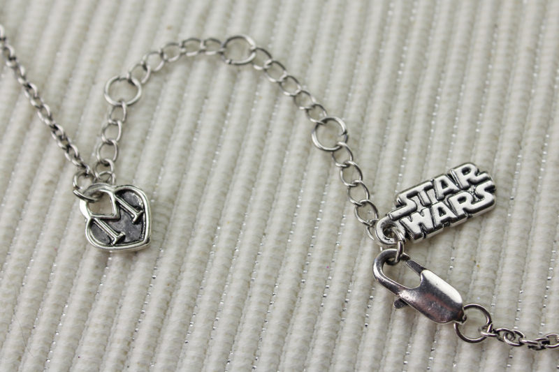 The Star Wars pendant measures approximately 14mm by 6mm, while the heart pendant measures approximately 11mm by 9mm. The heart pendant is double sided (same on both sides), while the back of the Star Wars pendant is flat, with the Lucasfilm copyright stamp ‘© LFL’. Both small pendants also have a touch of black antiquing, to match the Yoda pendant. While the end of a necklace isn’t usually very visible when wearing, I always appreciate little extra details like this.